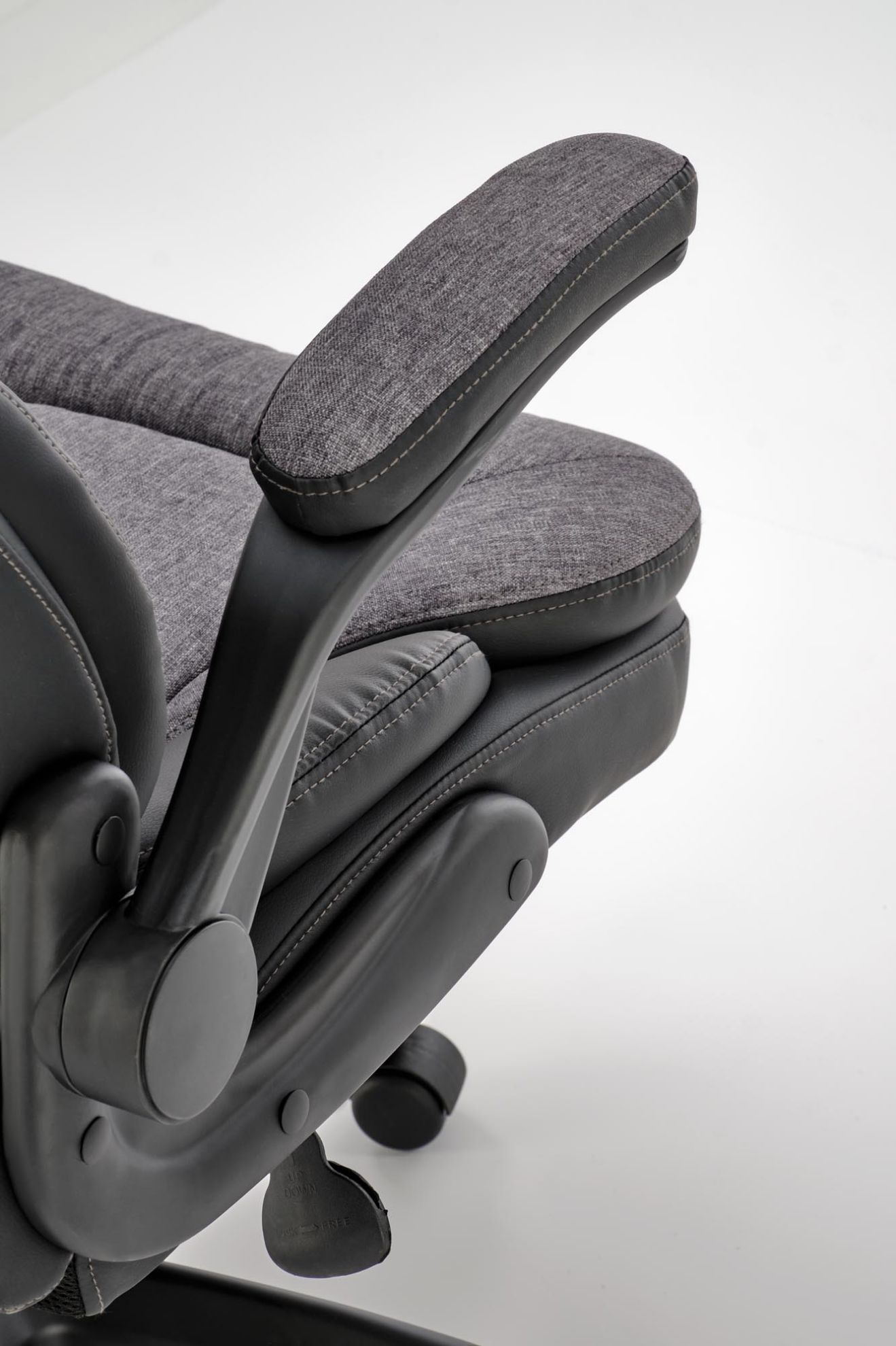 Fotel wyposażony jest w mechanizm TILT, który pozwala na swobodne bujanie się i blokadę w pozycji pionowej, zapewniając dodatkowy komfort i wsparcie dla kręgosłupa. Obicie wykonane jest z wysokiej jakości ecoskóry oraz tkaniny, co gwarantuje trwałość i łatwość w utrzymaniu czystości, jednocześnie oferując miękkość i wygodę.