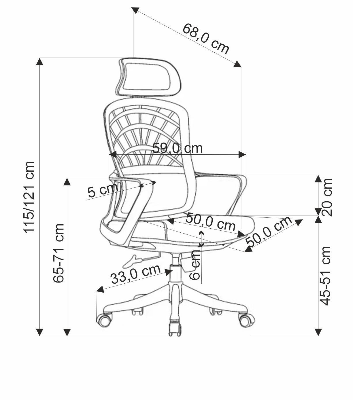 Wymiary fotela - 59 cm szerokości, 59 cm głębokości, oraz 115-121 cm wysokości, z regulowanym zagłówkiem - pozwalają na dopasowanie go do indywidualnych preferencji oraz ergonomiczną pozycję podczas długotrwałego siedzenia. Dodatkowo, wysokość siedziska można dostosować w zakresie 45-51 cm, co sprawia, że fotel Verso jest idealny dla osób o różnej budowie ciała.
