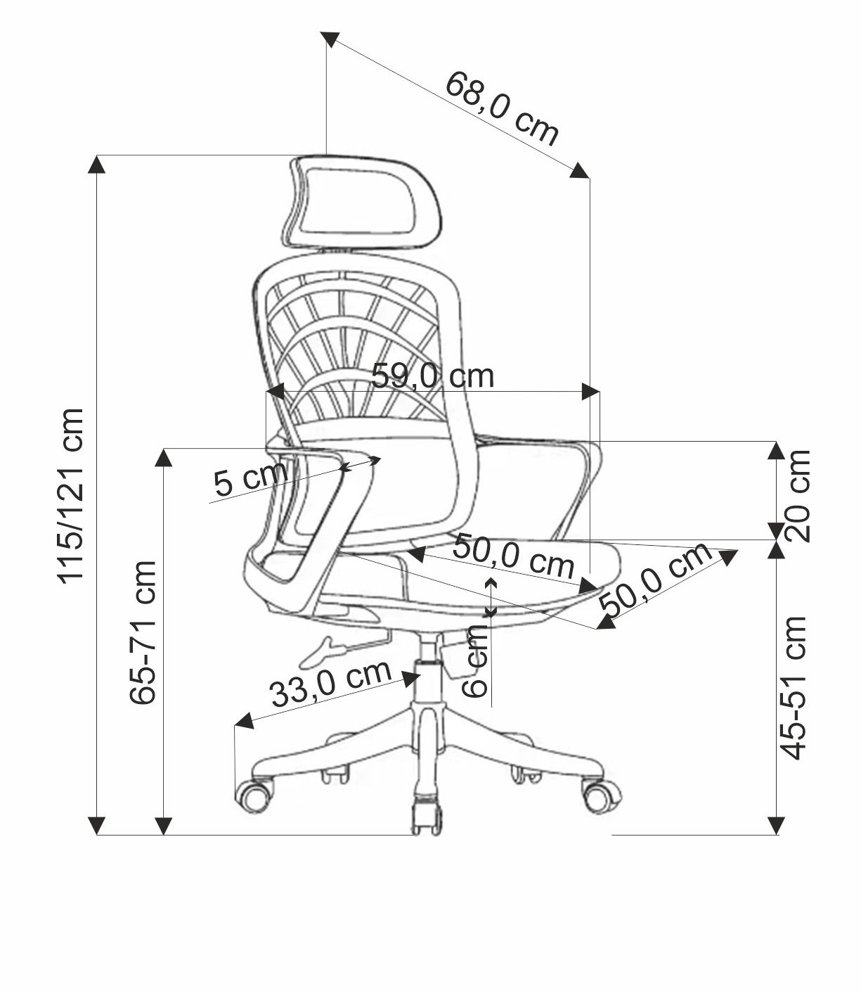 Wymiary fotela - 59 cm szerokości, 59 cm głębokości, oraz 115-121 cm wysokości, z regulowanym zagłówkiem - pozwalają na dopasowanie go do indywidualnych preferencji oraz ergonomiczną pozycję podczas długotrwałego siedzenia. Dodatkowo, wysokość siedziska można dostosować w zakresie 45-51 cm, co sprawia, że fotel Verso jest idealny dla osób o różnej budowie ciała.