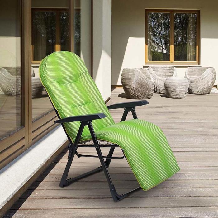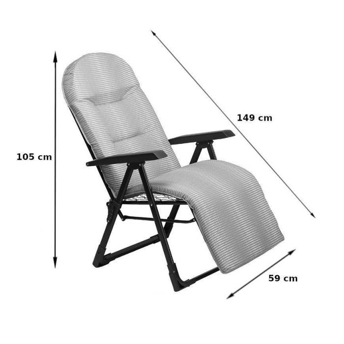 Wygodny rozkładany fotel z podnóżkiem jest idealny do odpoczynku w ogrodzie czy plażowania na wakacjach nad jeziorem. Posiada certyfikat "TUV".
