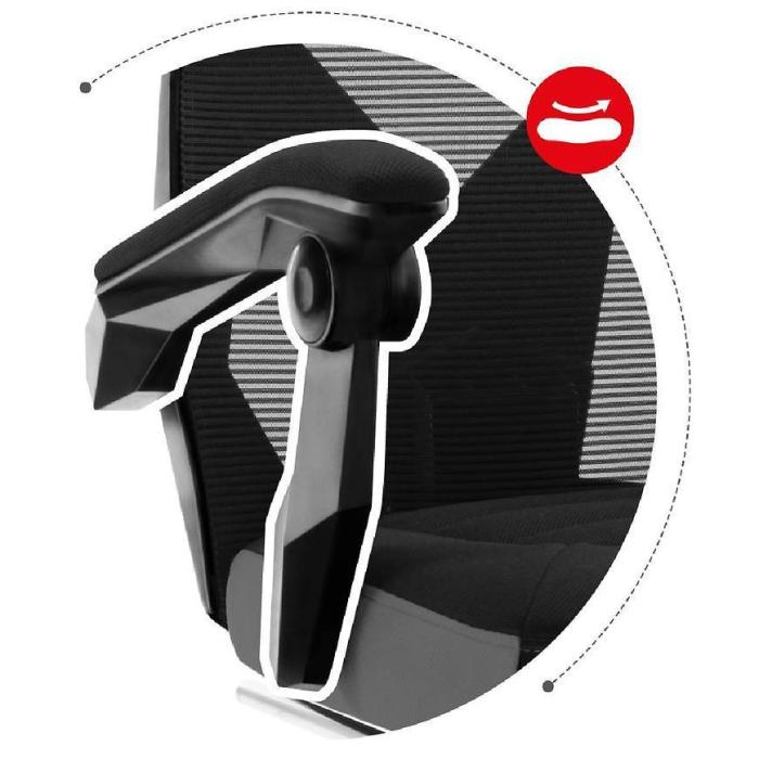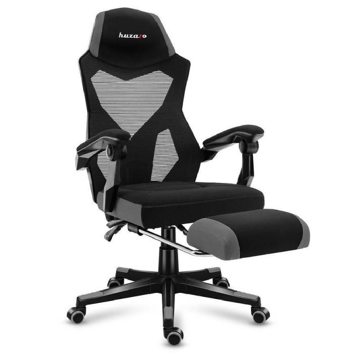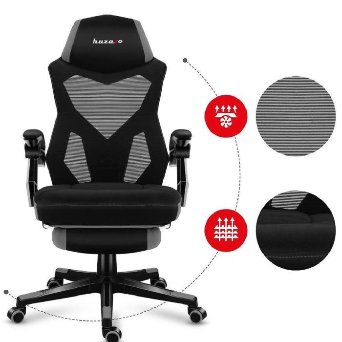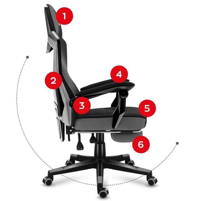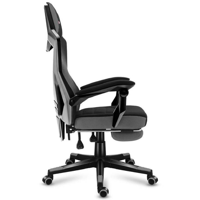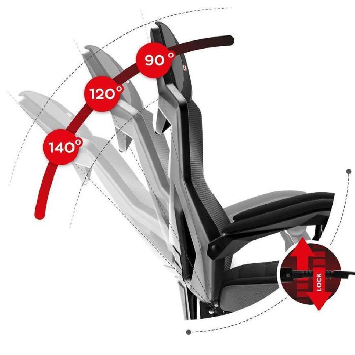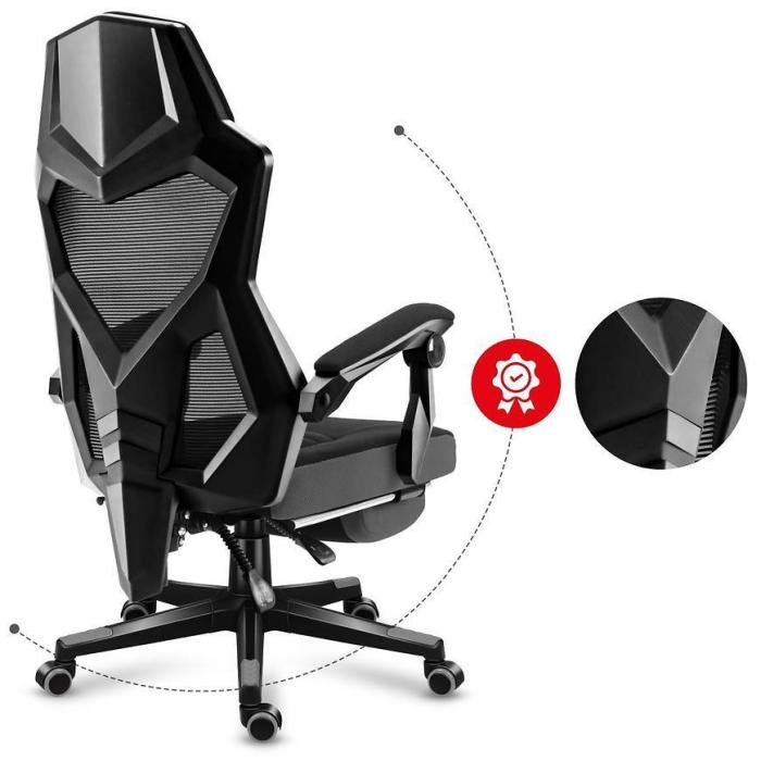 Fotel wykonano z wytrzymałej siatki i plastiku, co zapewnia trwałość, lekkość i łatwość utrzymania w czystości. Model wymaga złożenia, jednak montaż jest prosty i szybki. Typ oparcia z siatki zapewnia przewiewność i ergonomiczne podparcie pleców podczas długotrwałej gry. Podłokietniki są stałe i wygodne, a minimalistyczny design pasuje do każdego stanowiska gamingowego.