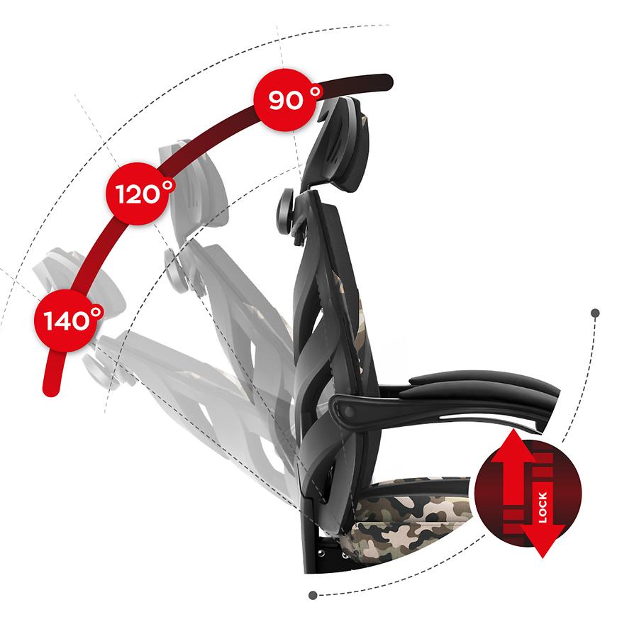 Fotel gamingowy HZ-Combat 5.0 Camo został zaprojektowany z myślą o różnych typach sylwetek. Maksymalne obciążenie fotela wynosi 140 kg, a jego wysokość całkowita może być dostosowana w zakresie od 120 cm do 130 cm. Wysokość siedziska również jest regulowana, umożliwiając ustawienie w przedziale od 55 cm do 65 cm. Dzięki temu fotel może być dopasowany do indywidualnych preferencji użytkownika, zapewniając optymalne podparcie dla nóg i kręgosłupa.