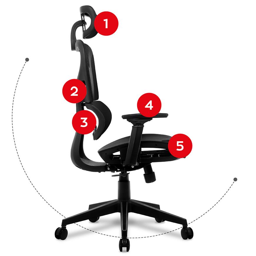 Regulowany zagłówek, wysokość i podłokietniki pozwalają na dopasowanie fotela do indywidualnych preferencji użytkownika, zapewniając wygodę i wsparcie dla szyi i kręgosłupa.