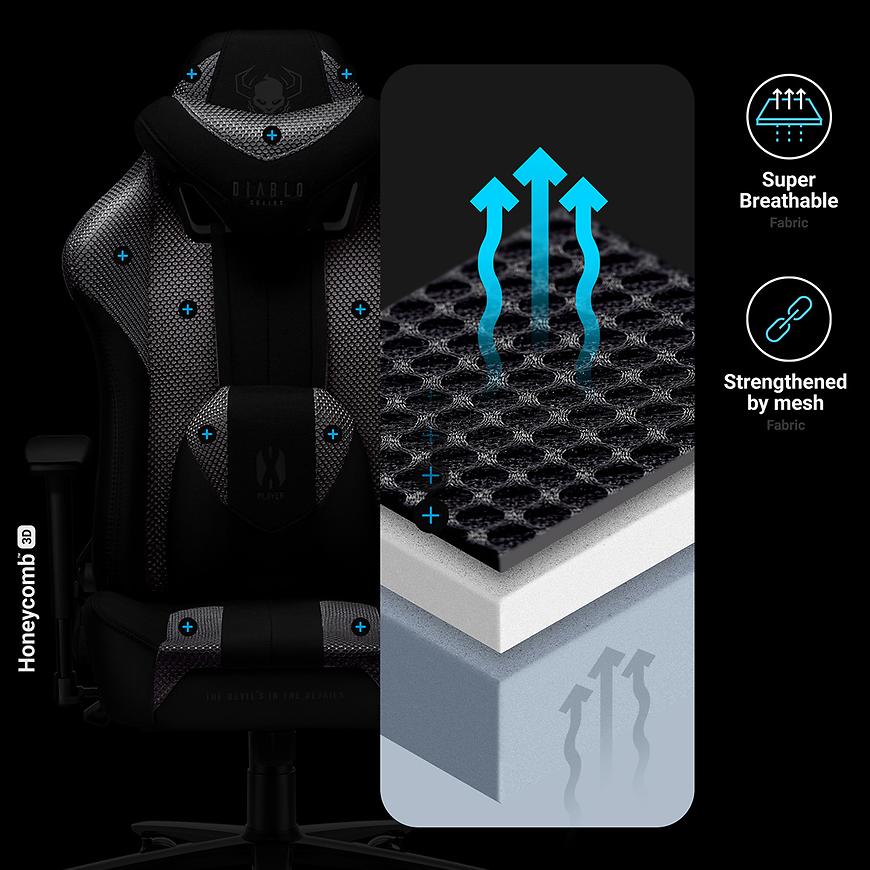 Diablo X-Player 2.0 oferuje wysoką jakość tapicerki wykonanej z wytrzymałego włókna EcoFiber™ oraz siateczki Diablo Honeycomb™, co gwarantuje doskonałą cyrkulację powietrza nawet podczas najdłuższych sesji grania. Ekoskóra HDS™ dodaje fotelowi charakteru, podczas gdy precyzyjne przeszycia Nylon™ LV3 zapewniają długotrwałą trwałość i estetykę.