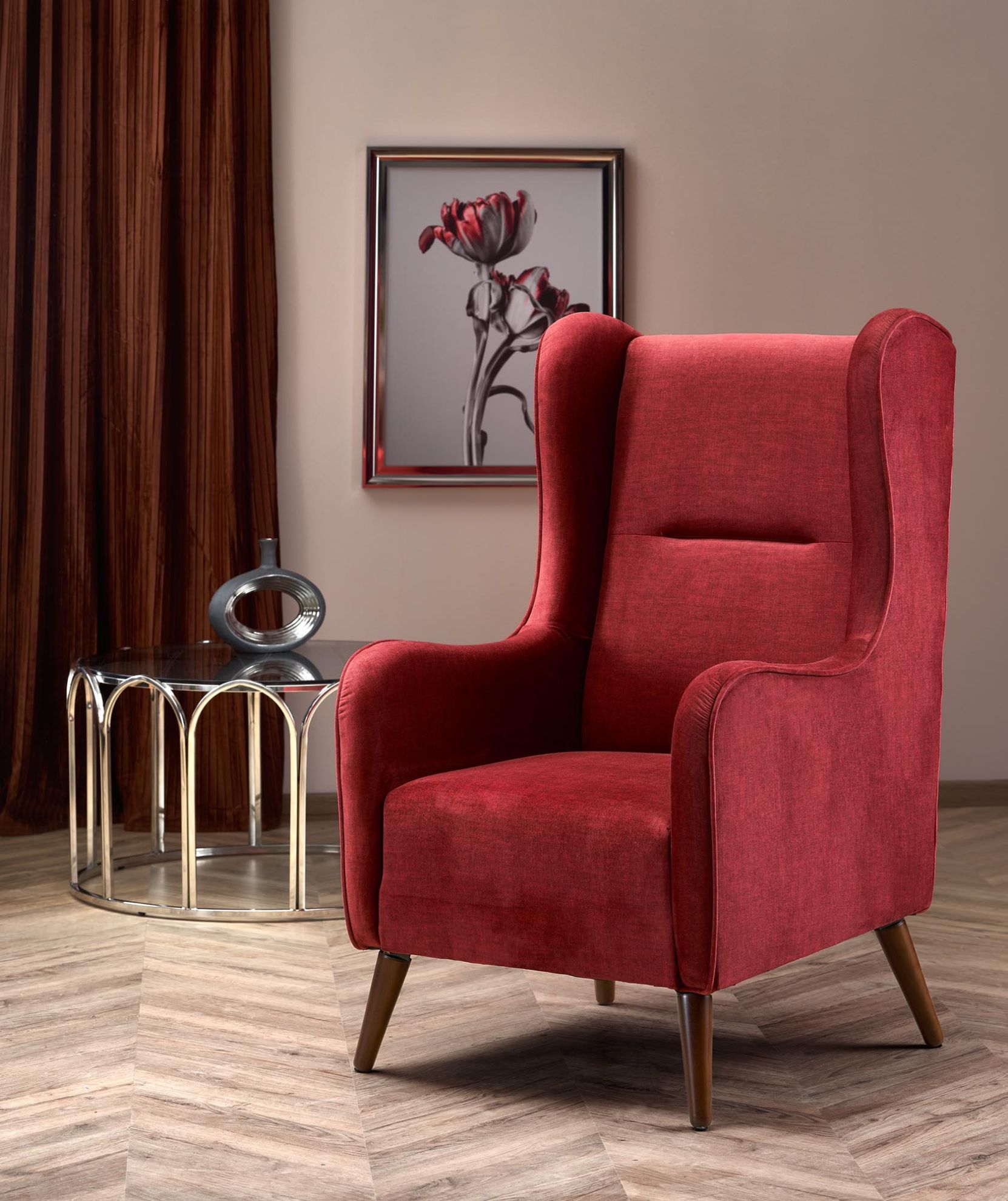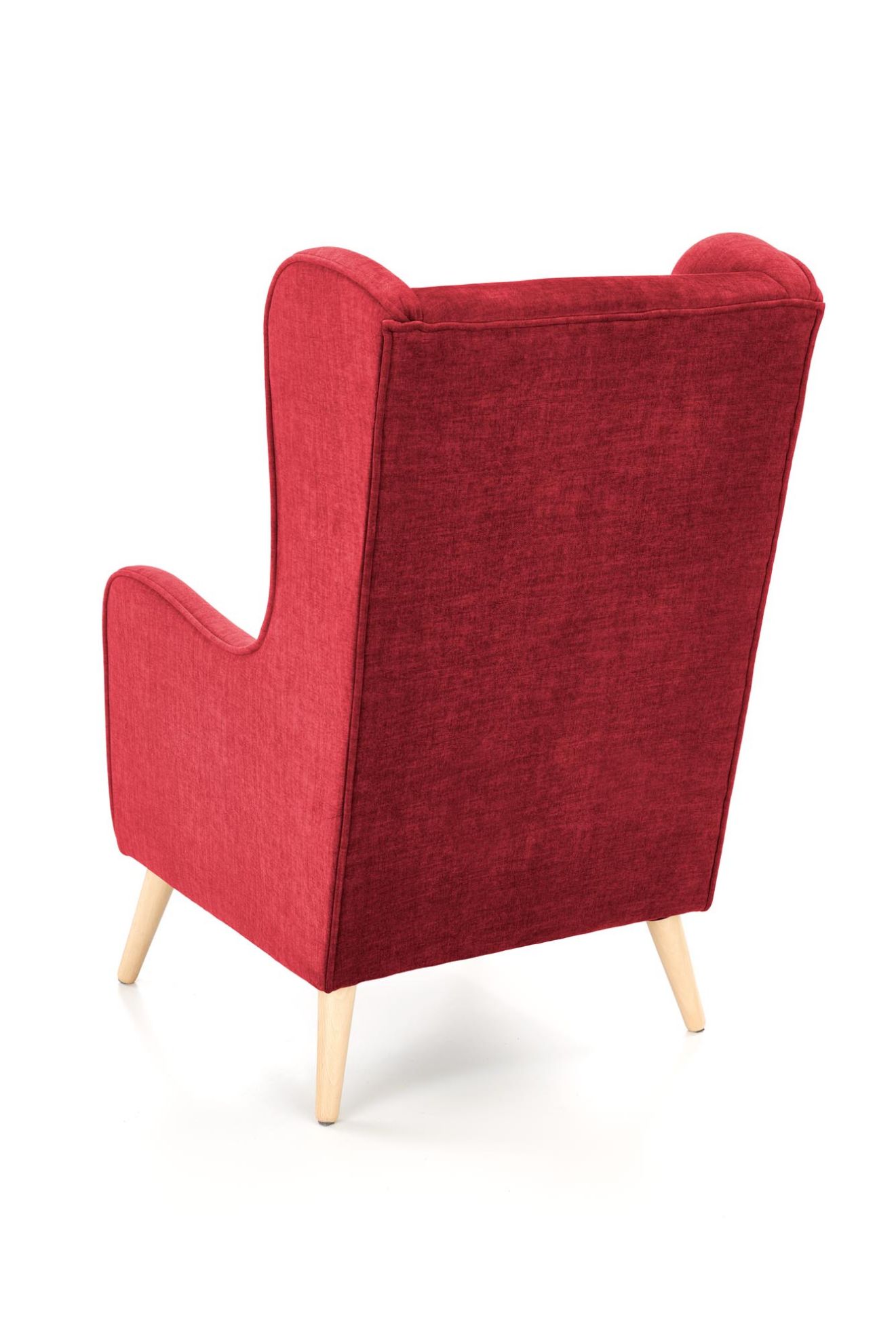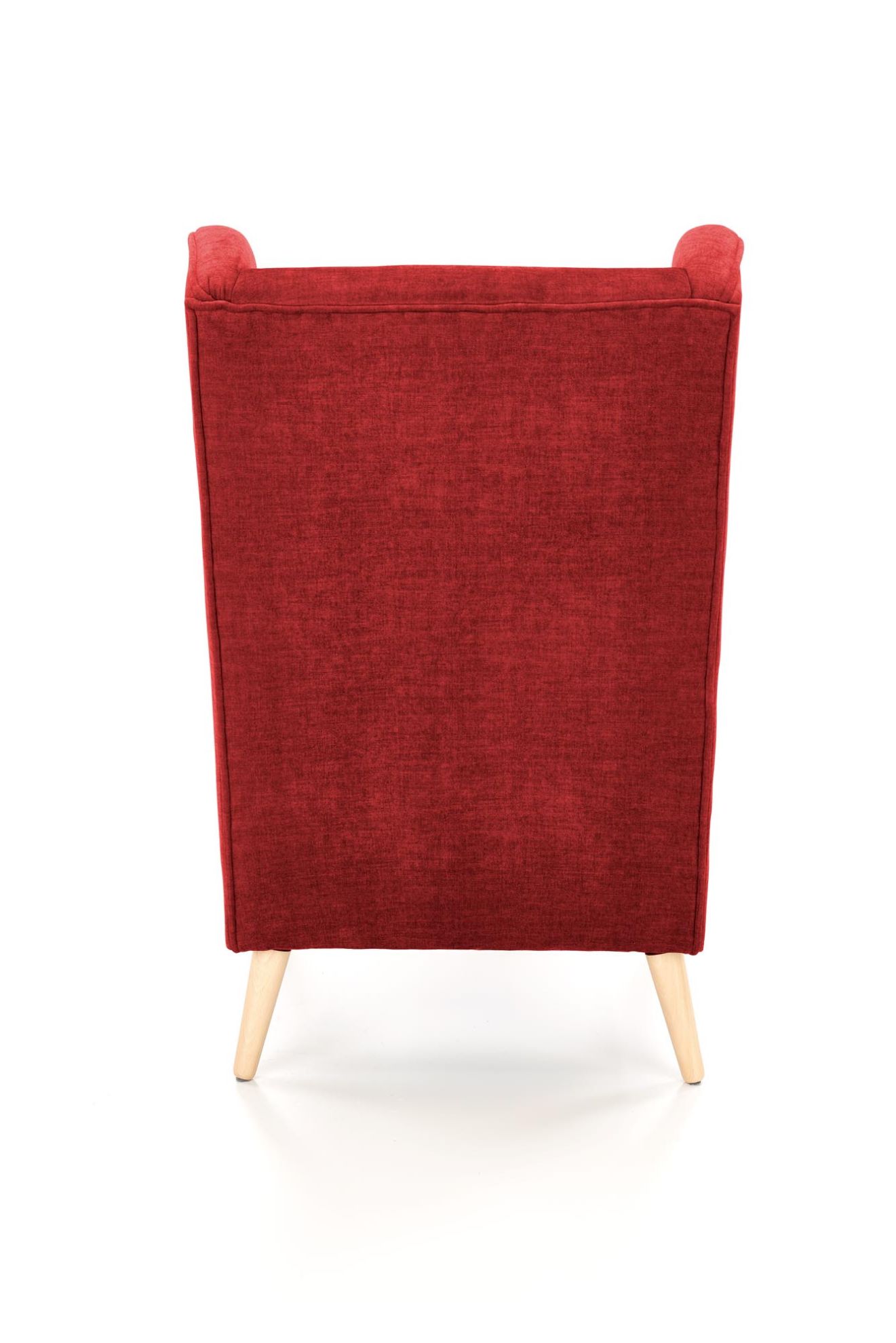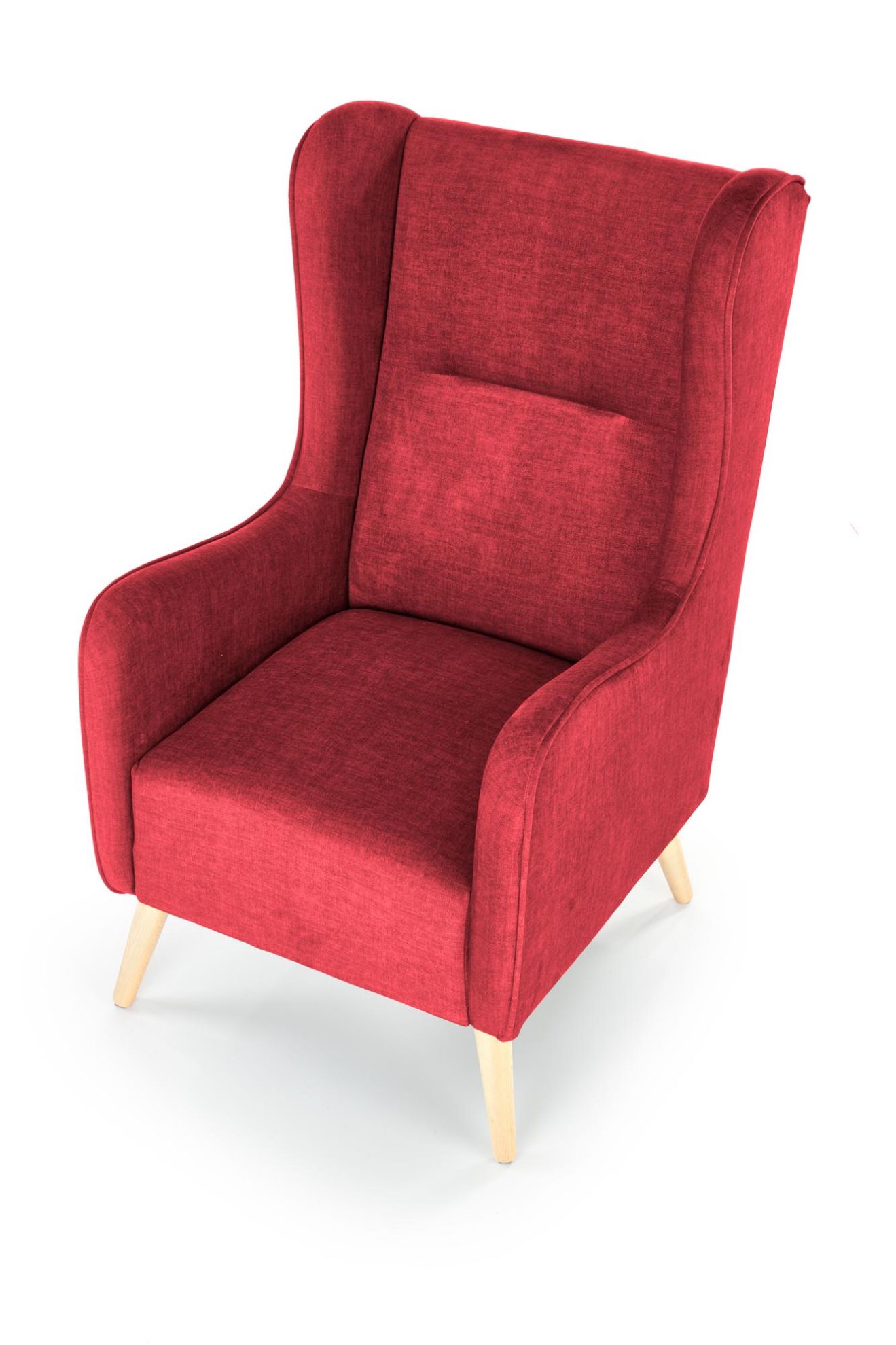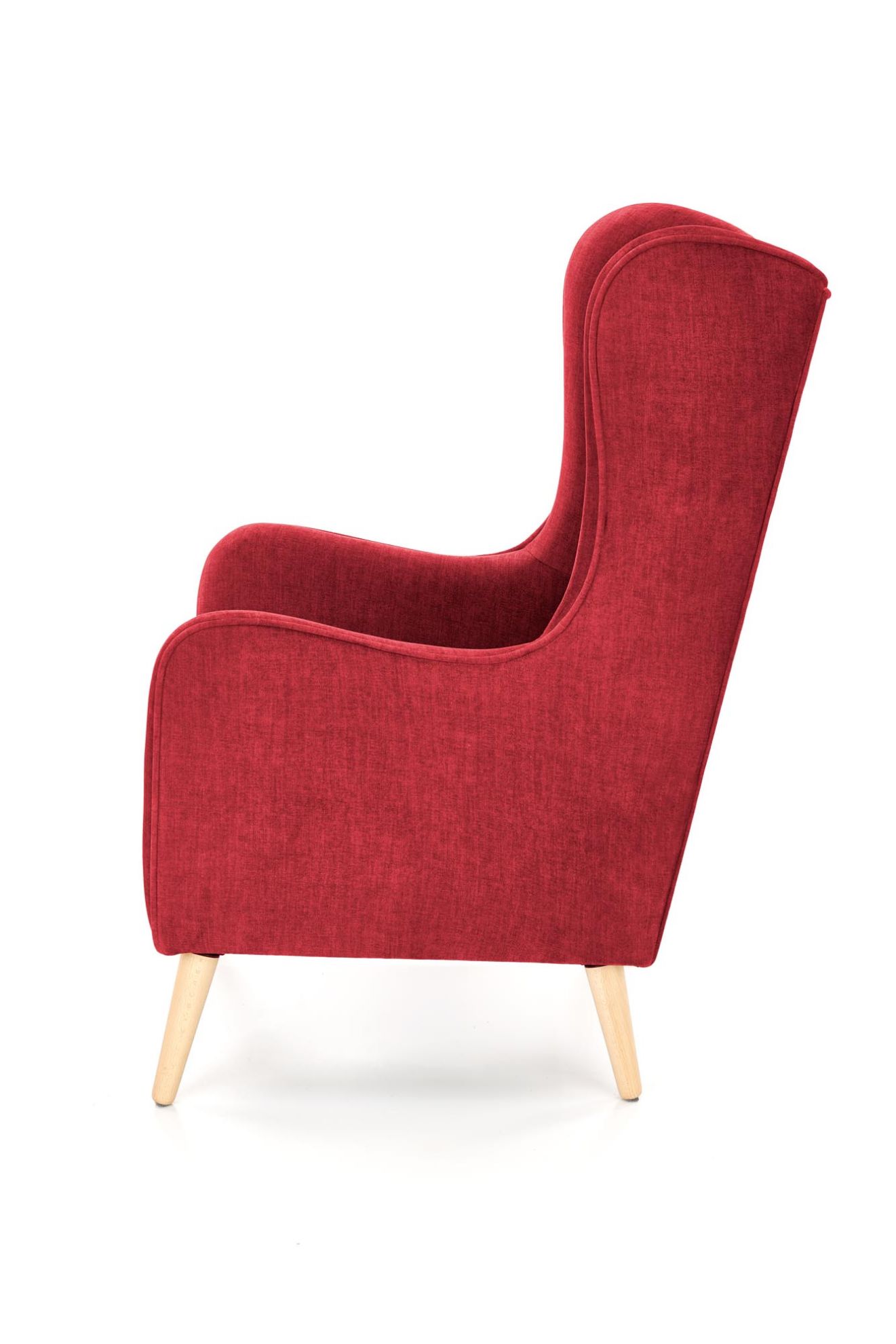 Nogi fotela wykonane są z trwałego drewna litego w naturalnym kolorze. Drewno nadaje fotelowi ciepły, przytulny charakter i harmonijnie komponuje się z bordową tapicerką. Naturalne drewno jest nie tylko estetyczne, ale także trwałe, co gwarantuje długotrwałą użyteczność fotela.