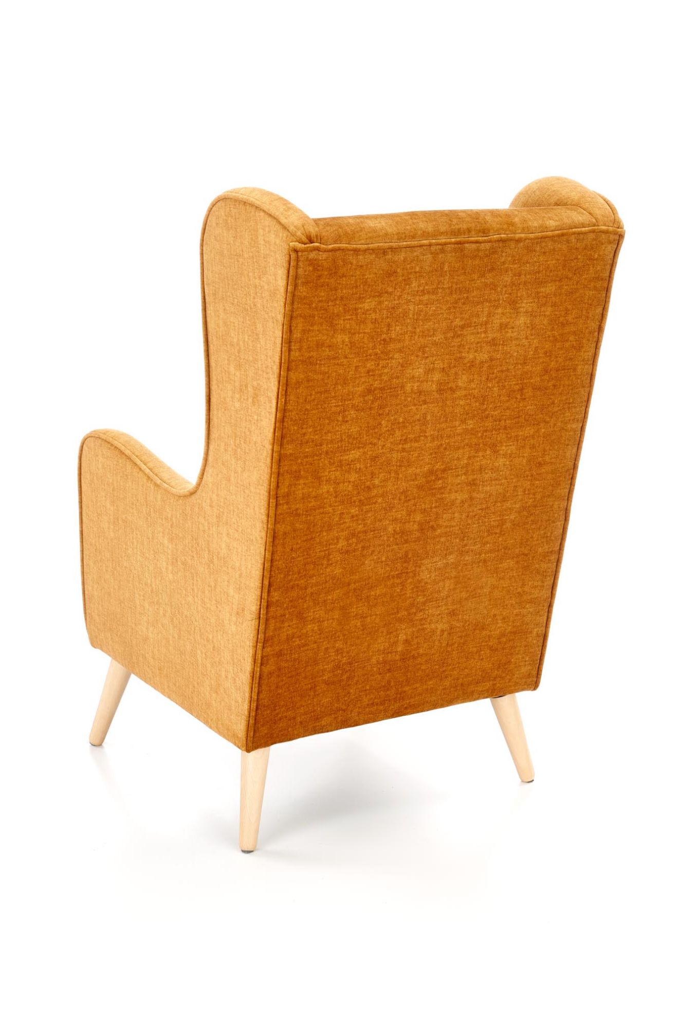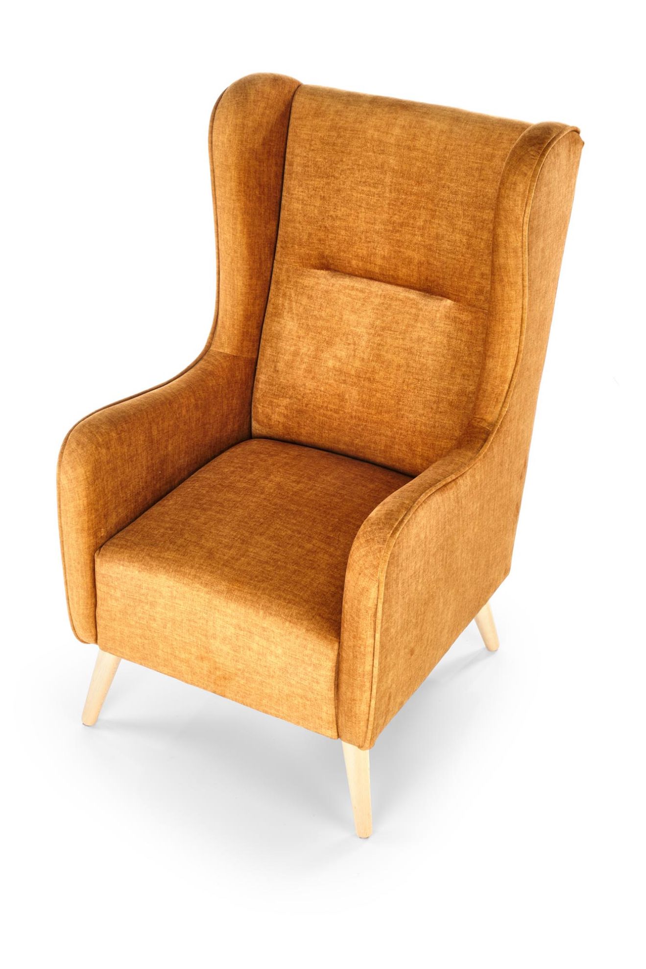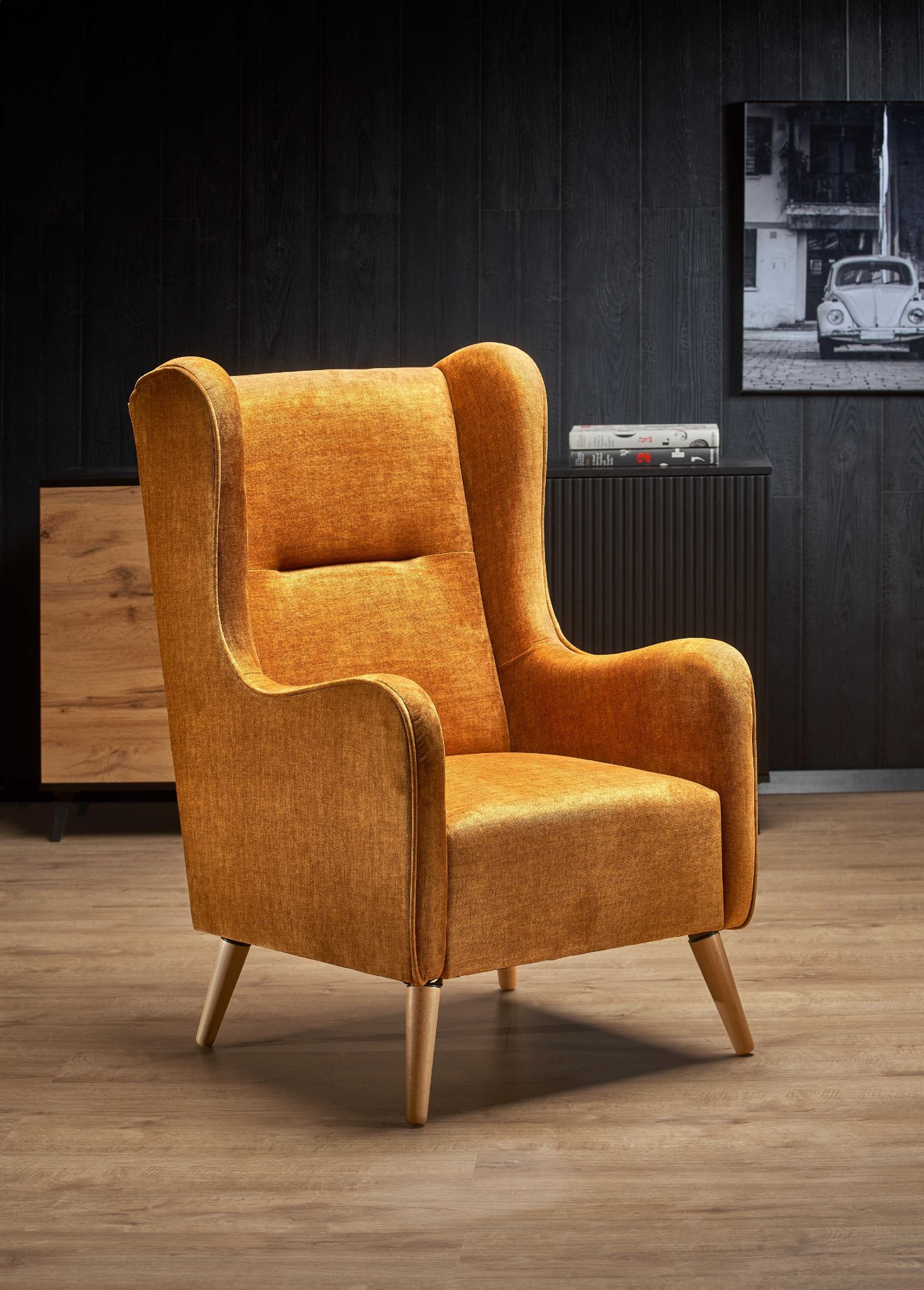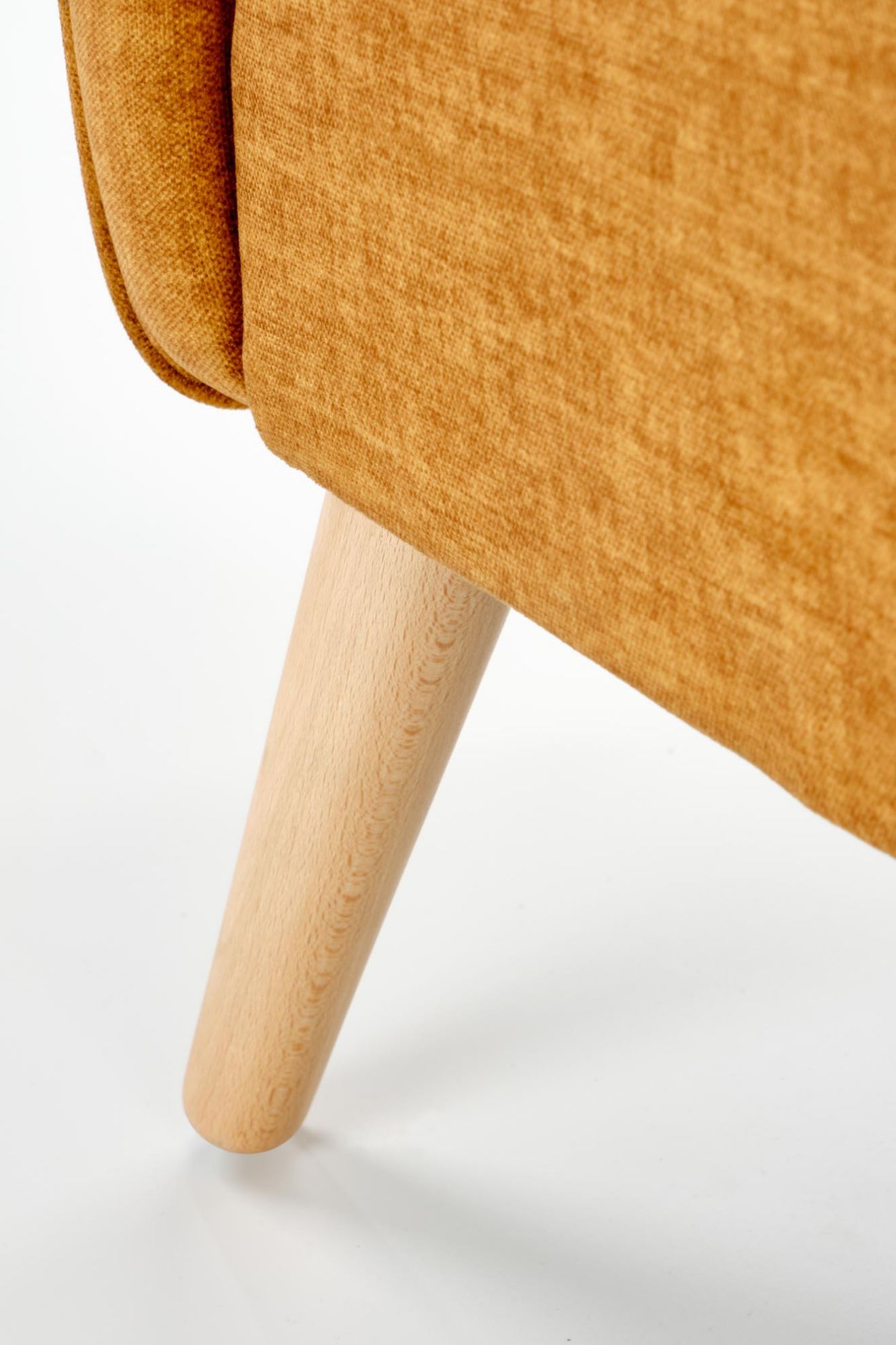 Nogi fotela wykonane są z trwałego drewna litego w naturalnym kolorze. Drewno nadaje fotelowi ciepły, przytulny charakter i harmonijnie komponuje się z miodową tapicerką. Naturalne drewno jest nie tylko estetyczne, ale także trwałe, co gwarantuje długotrwałą użyteczność fotela.
