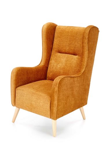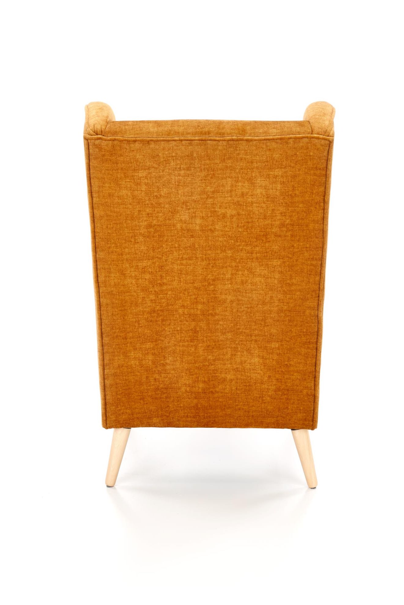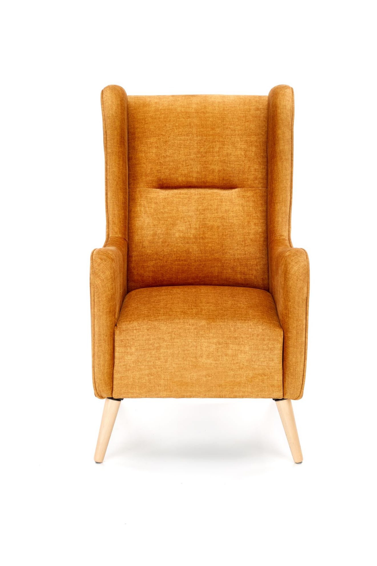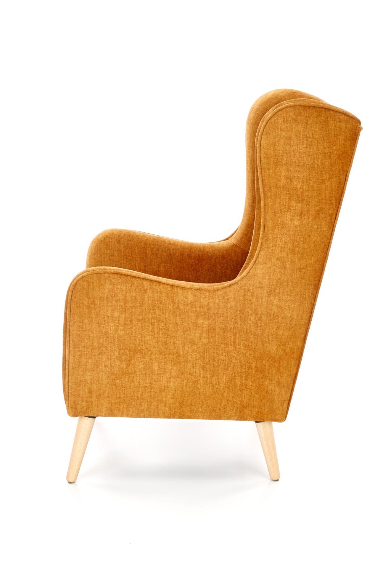 Nogi fotela wykonane są z trwałego drewna litego w naturalnym kolorze. Drewno nadaje fotelowi ciepły, przytulny charakter i harmonijnie komponuje się z miodową tapicerką. Naturalne drewno jest nie tylko estetyczne, ale także trwałe, co gwarantuje długotrwałą użyteczność fotela.