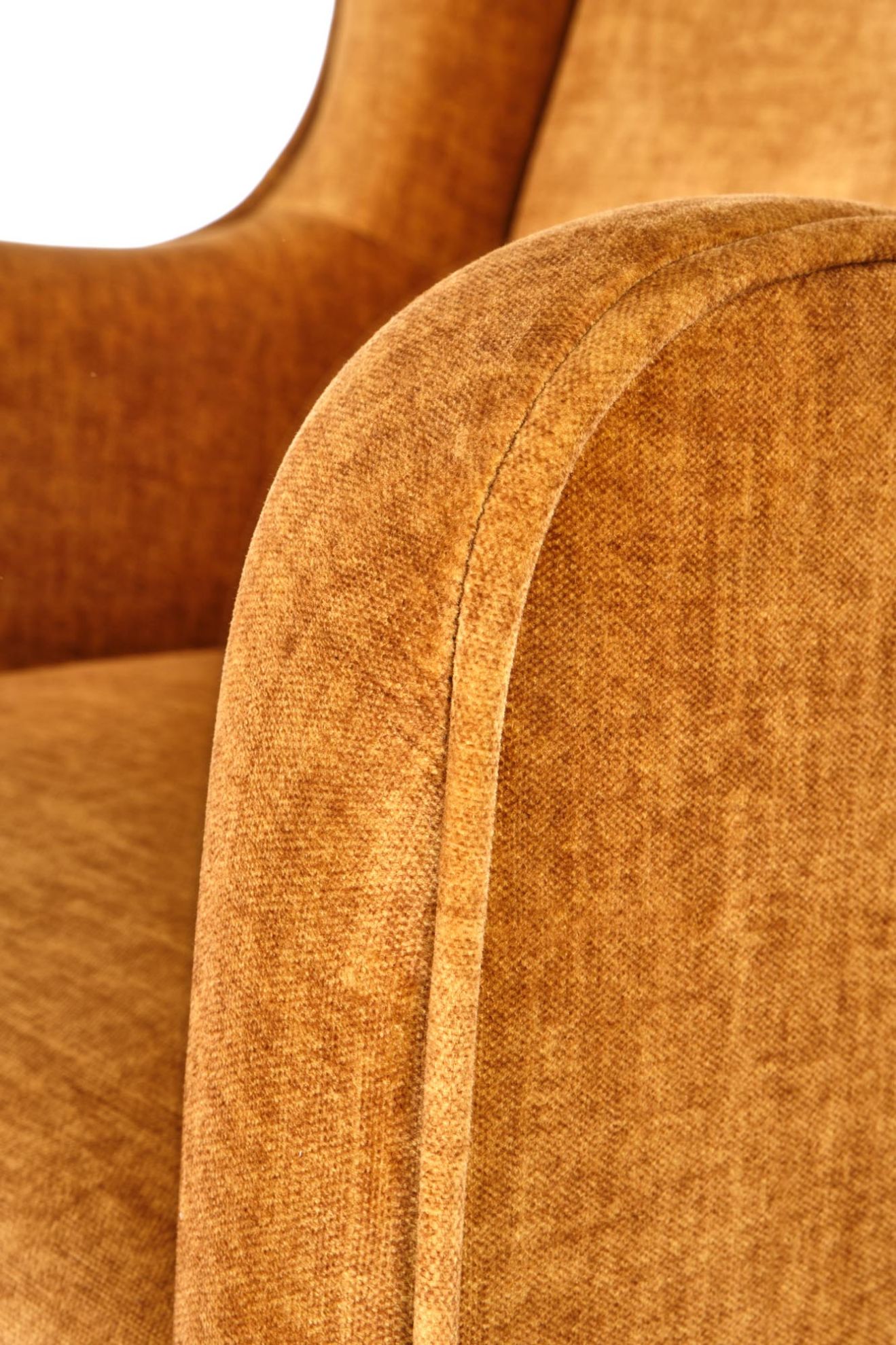 Tapicerka fotela wykonana jest z wysokiej jakości tkaniny o eleganckim miodowym kolorze. Tkanina jest miękka w dotyku, co sprawia, że siedzenie jest niezwykle komfortowe. Jest to idealne miejsce, aby zrelaksować się po długim dniu pracy lub zanurzyć się w ulubionej książce.