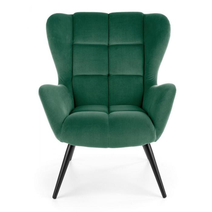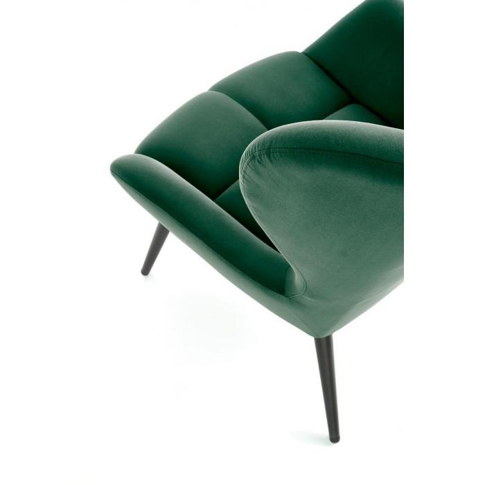 Tapicerka fotela wykonana jest z miękkiej i przyjemnej w dotyku tkaniny (BLUVEL 78) w głębokim, ciemno zielonym odcieniu. Ten odważny kolor nadaje fotelowi wyrafinowanego charakteru i dodaje pomieszczeniu głębi. Tkanina jest nie tylko estetyczna, ale także miękka, co gwarantuje niezrównany komfort siedzenia.