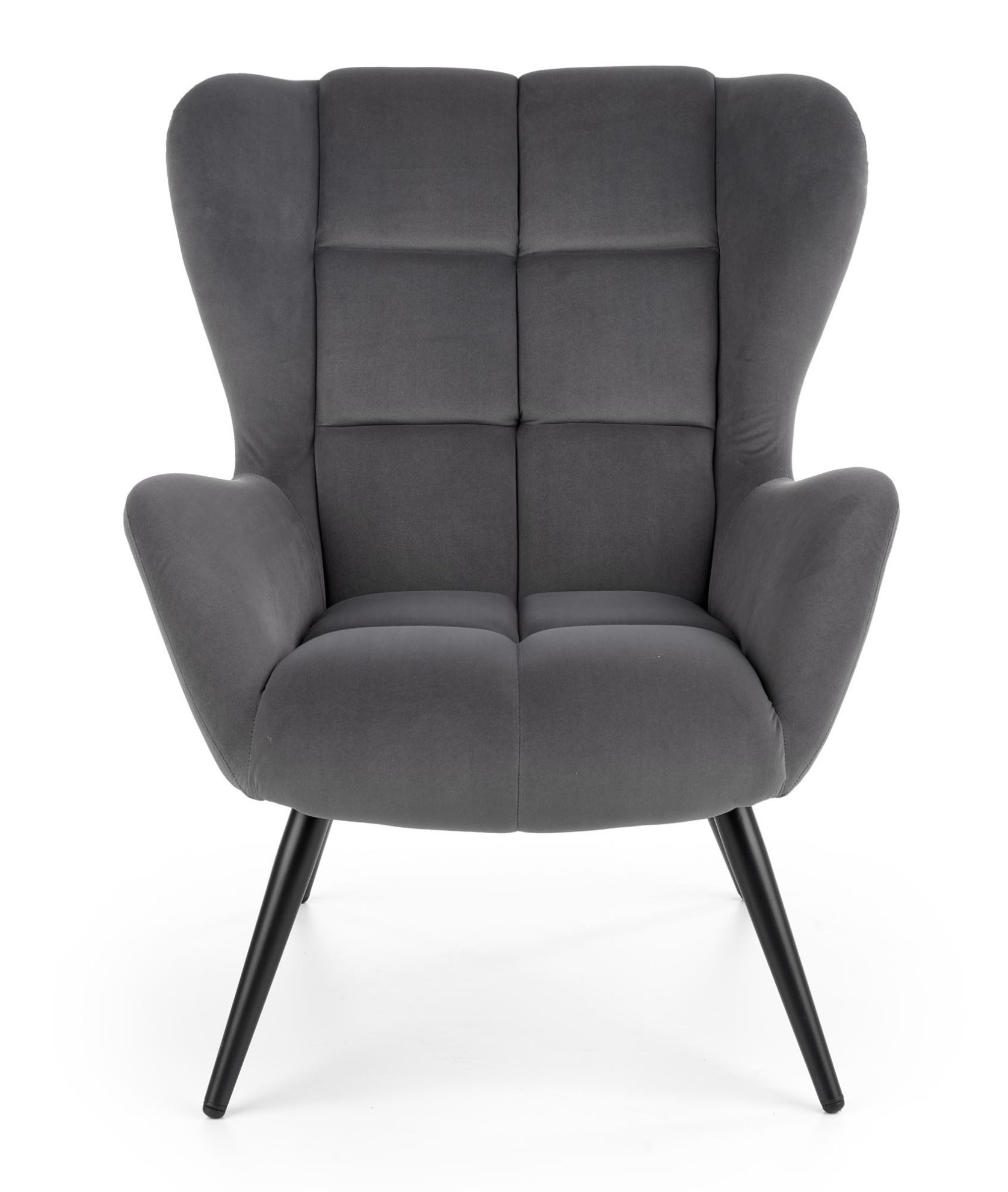 Tapicerka fotela wykonana jest z miękkiej i przyjemnej w dotyku tkaniny (BLUVEL 14) w głębokim, popielatym odcieniu. Ten odważny kolor nadaje fotelowi wyrafinowanego charakteru i dodaje pomieszczeniu głębi. Tkanina jest nie tylko estetyczna, ale także miękka, co gwarantuje niezrównany komfort siedzenia.