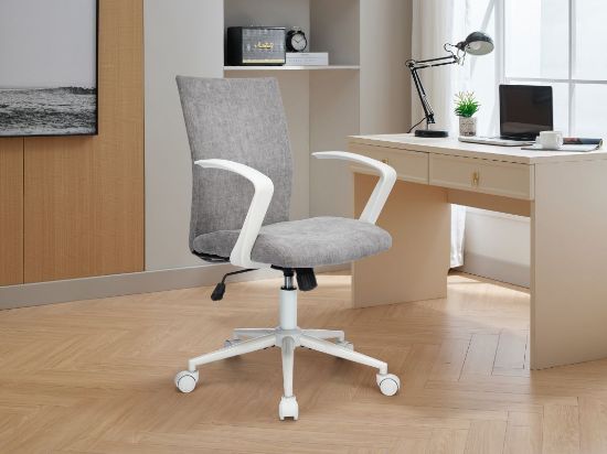 Fotel obrotowy Fiori to połączenie elegancji i funkcjonalności, które doskonale sprawdzi się w biurze, gabinecie czy domowym miejscu pracy. Tkanina Fiori w kolorze popielatym nadaje mu subtelny, nowoczesny charakter, białe podłokietniki i podstawa tworzą harmonijną, estetyczną całość.