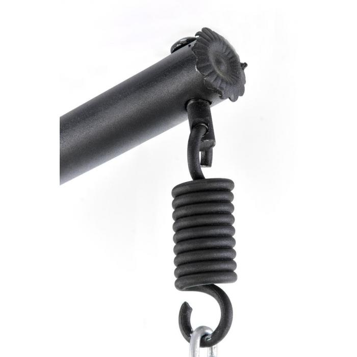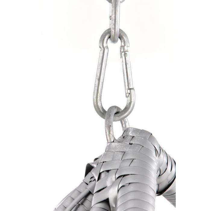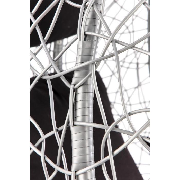 Kosz fotela wykonano z trwałego materiału w kolorze popielatym, odpornym na warunki atmosferyczne i codzienne użytkowanie. Metalowa, czarna rama zapewnia solidną konstrukcję i stabilność mebla. Fotel wymaga montażu, ale składanie jest szybkie i intuicyjne, co pozwala cieszyć się komfortem zaraz po ustawieniu go w wybranym miejscu.