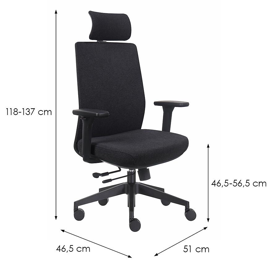Fotel Prospero Tkanina w kolorze czarnym to ergonomiczne krzesło obrotowe do biura, wykonane z połączenia plastiku i tkaniny, z komfortowym siedziskiem wypełnionym pianką. Wyposażony jest w regulowany zagłówek i podłokietniki, co pozwala dostosować go do indywidualnych potrzeb użytkownika. Wysokość całkowita fotela regulowana jest w zakresie od 118 do 137 cm, a wysokość siedziska od 465 do 565 mm. Fotel waży 18,3 kg, wymaga samodzielnego złożenia i zapewnia wygodę oraz stabilność podczas wielogodzinnej pracy.