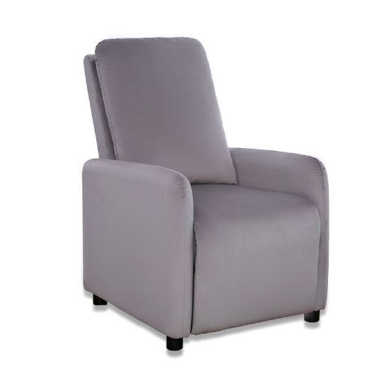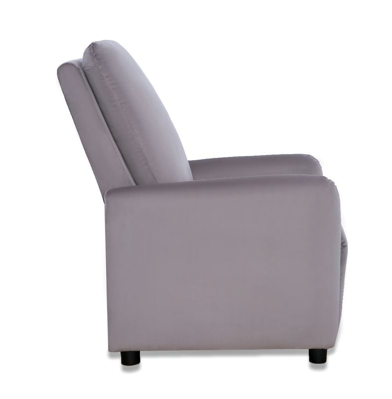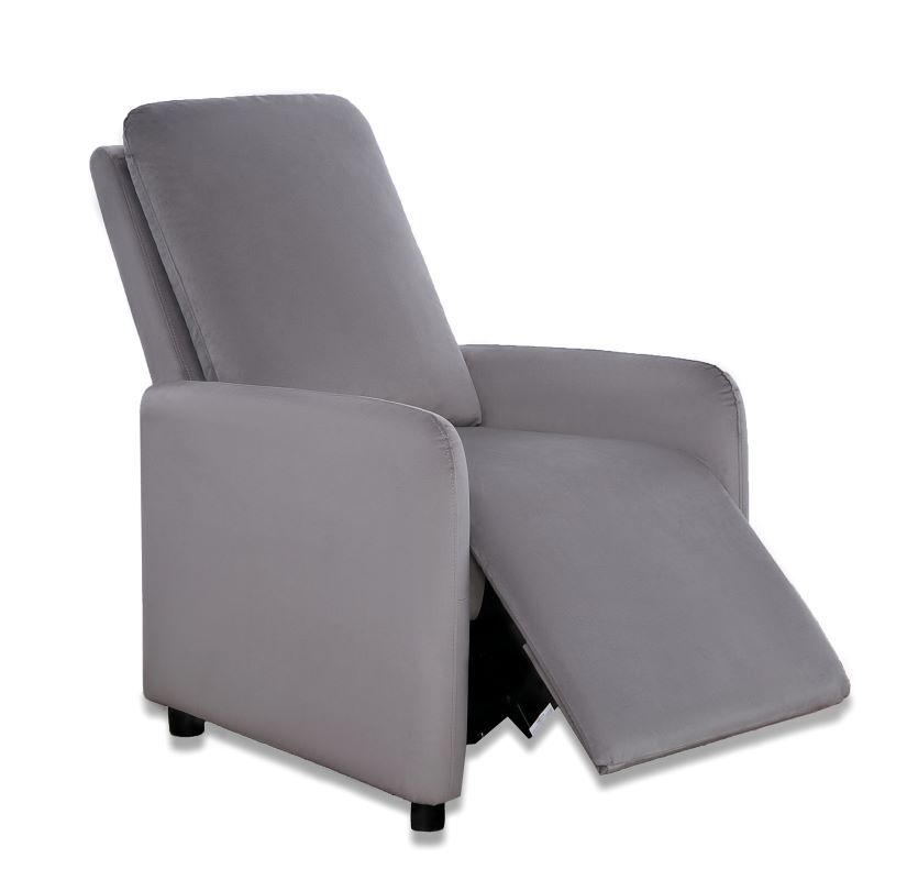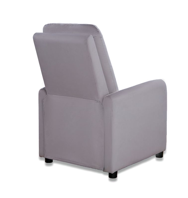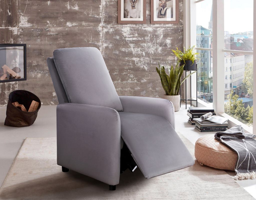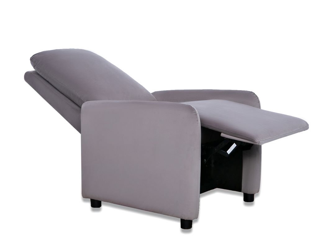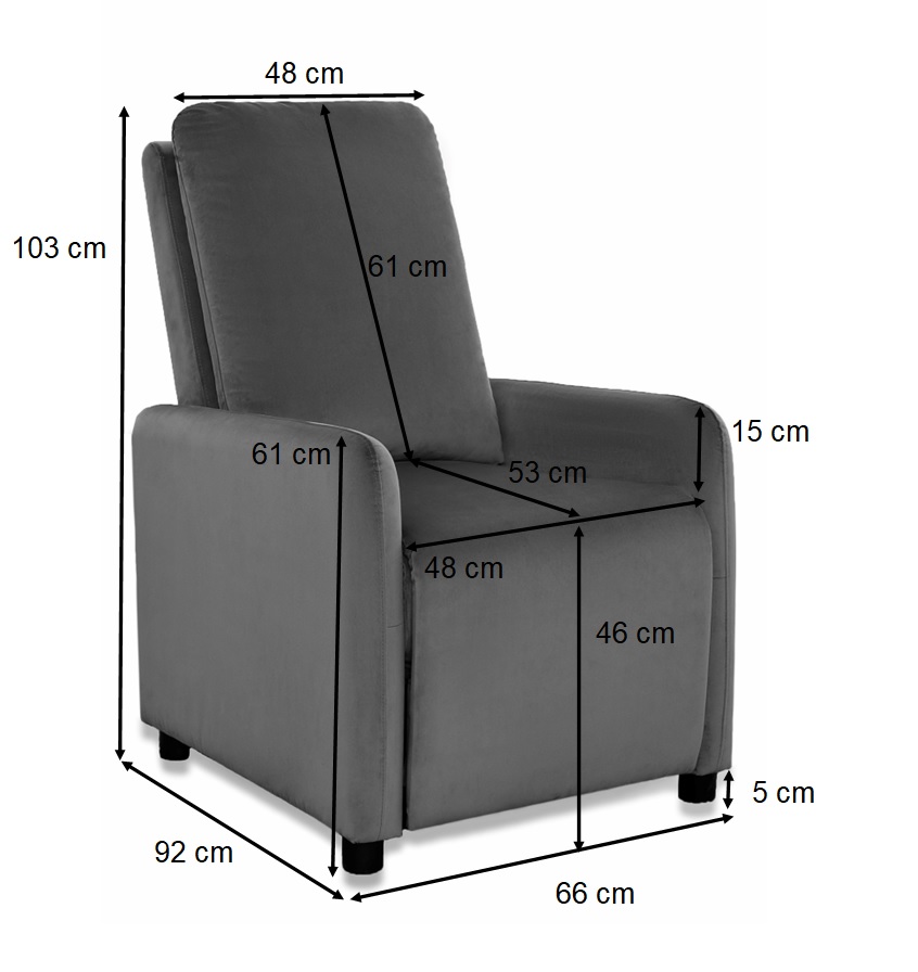 Fotel Remi dostępny w kolorze beż, ciemny popiel oraz ciemny granat. Fotel wykonany w tkaninie welurowej, która jest miękka i przyjemna w dotyku, ponadto tkanina nie gniecie się łatwo, jest wytrzymała, odporna na rozrywanie i rozciąganie. Fotel posiada delikatnie wyprofilowane kształty. Dzięki funkcji push-back wystarczy delikatnie odchylić się do tyłu, aby poczuć, jak oparcie i podnóżek idealnie dopasowują się do ciała. Siedzisko wypełnione jest sprężyną falistą oraz pianką wysokoelastyczną, które dodatkowo zapewnią klientowi komfort wypoczynku. Nóżki plastikowe czarne o wysokości 5 cm. Maksymalne obciążenie fotela wynosi 110 kg.