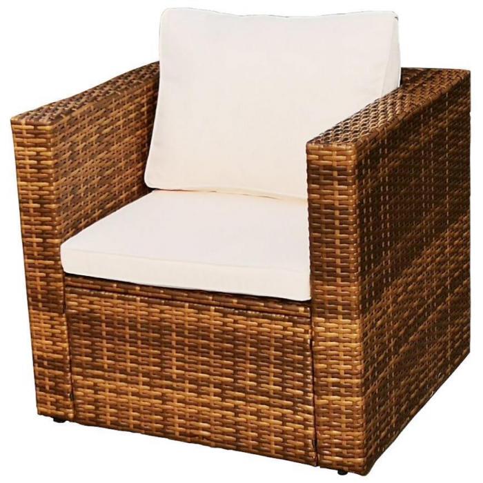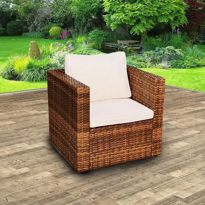 Materiał wykonania to technorattan. Konstrukcja mebla jest metalowa. Szerokie podłokietniki oraz poduszka gwarantują maksimum komfortu i wygody. Fotel Lord można zakupić do kompletu mebli wypoczynkowych Malta, Cezar, Sofia i Holiday w tym samym kolorze.