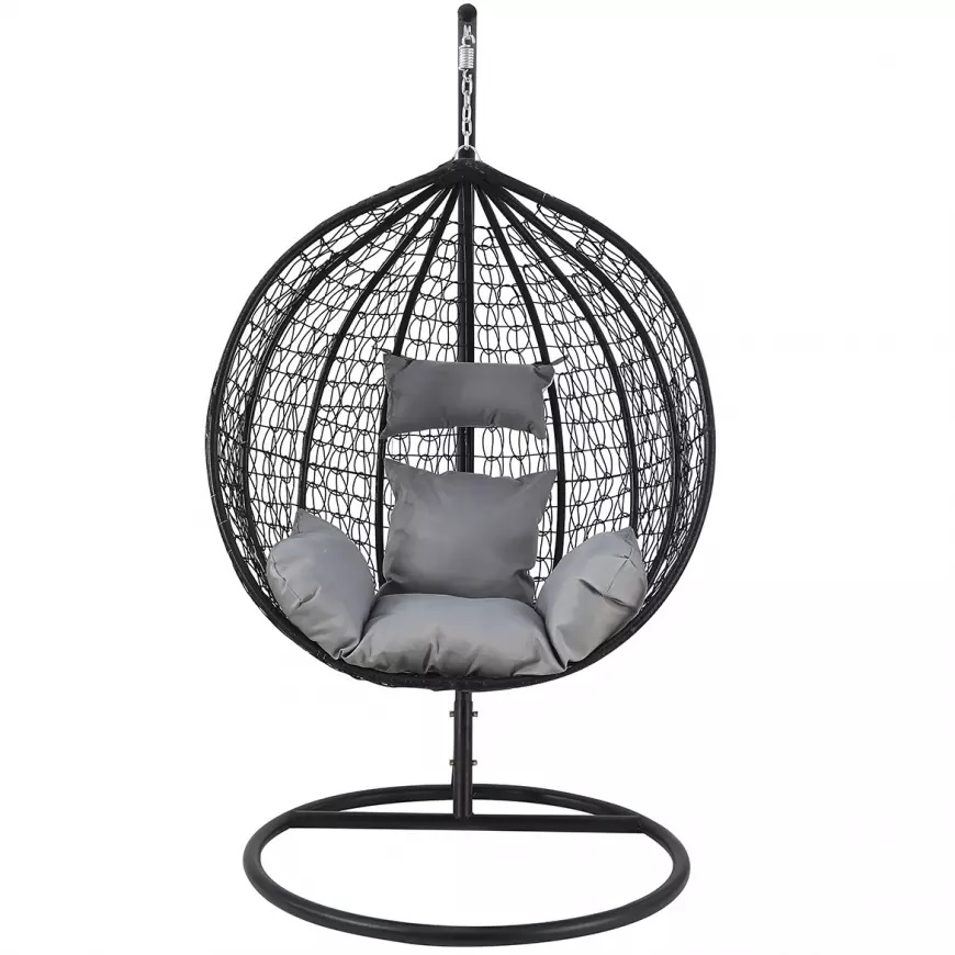Czarny kolor ramy i kosza nadaje fotelowi solidności i nowoczesności, doskonale komponuje się z różnorodnymi aranżacjami wnętrz. Dodatkowo, szare poduszki w komplecie nie tylko zapewniają wyjątkowy komfort, ale również stanowią harmonijne dopełnienie całości.