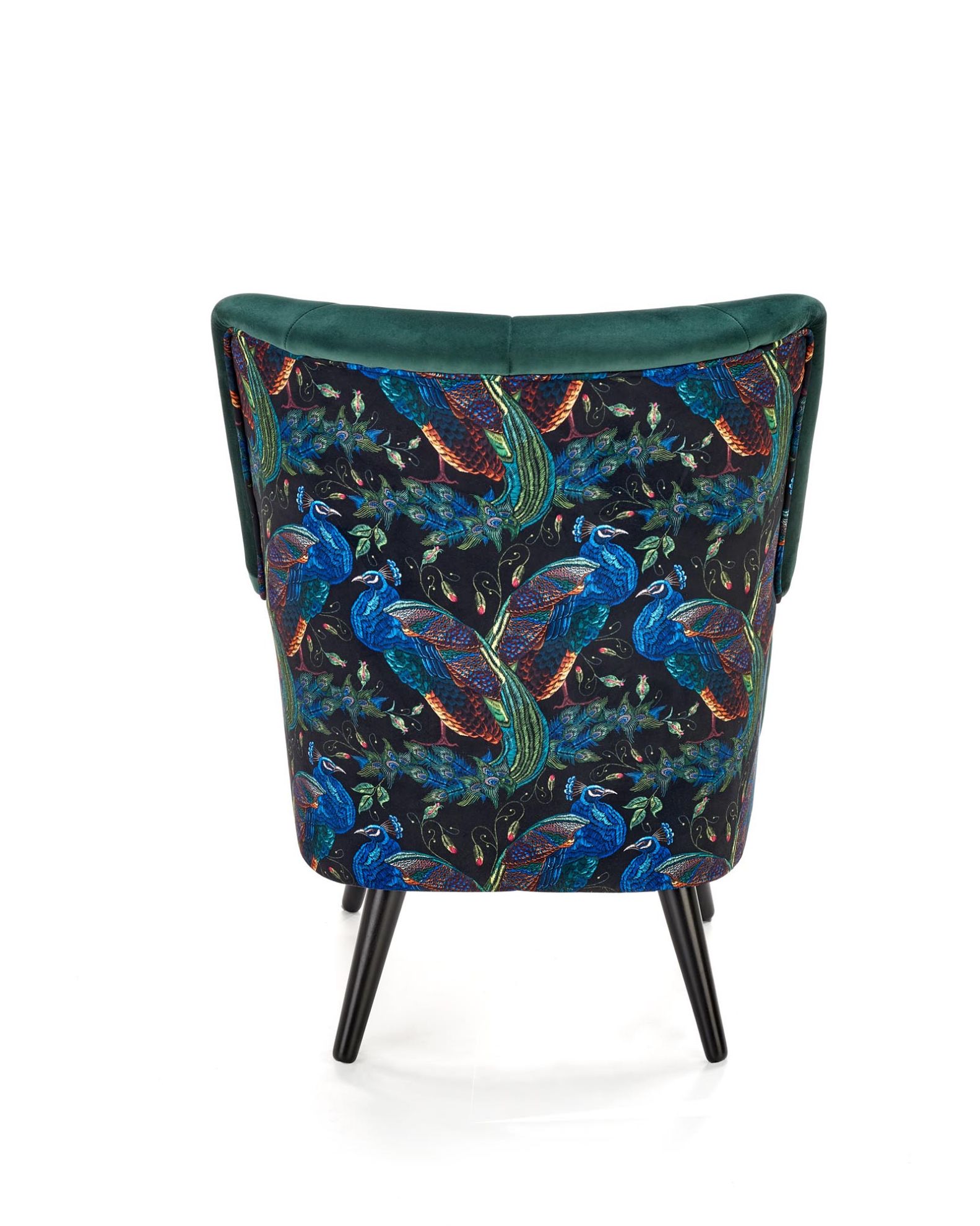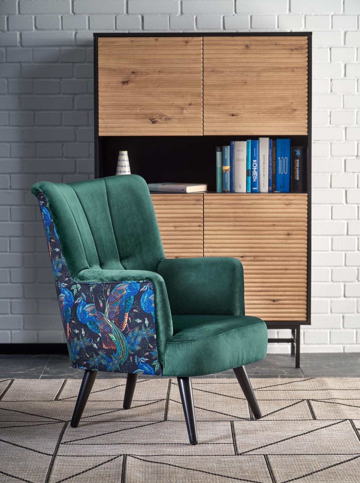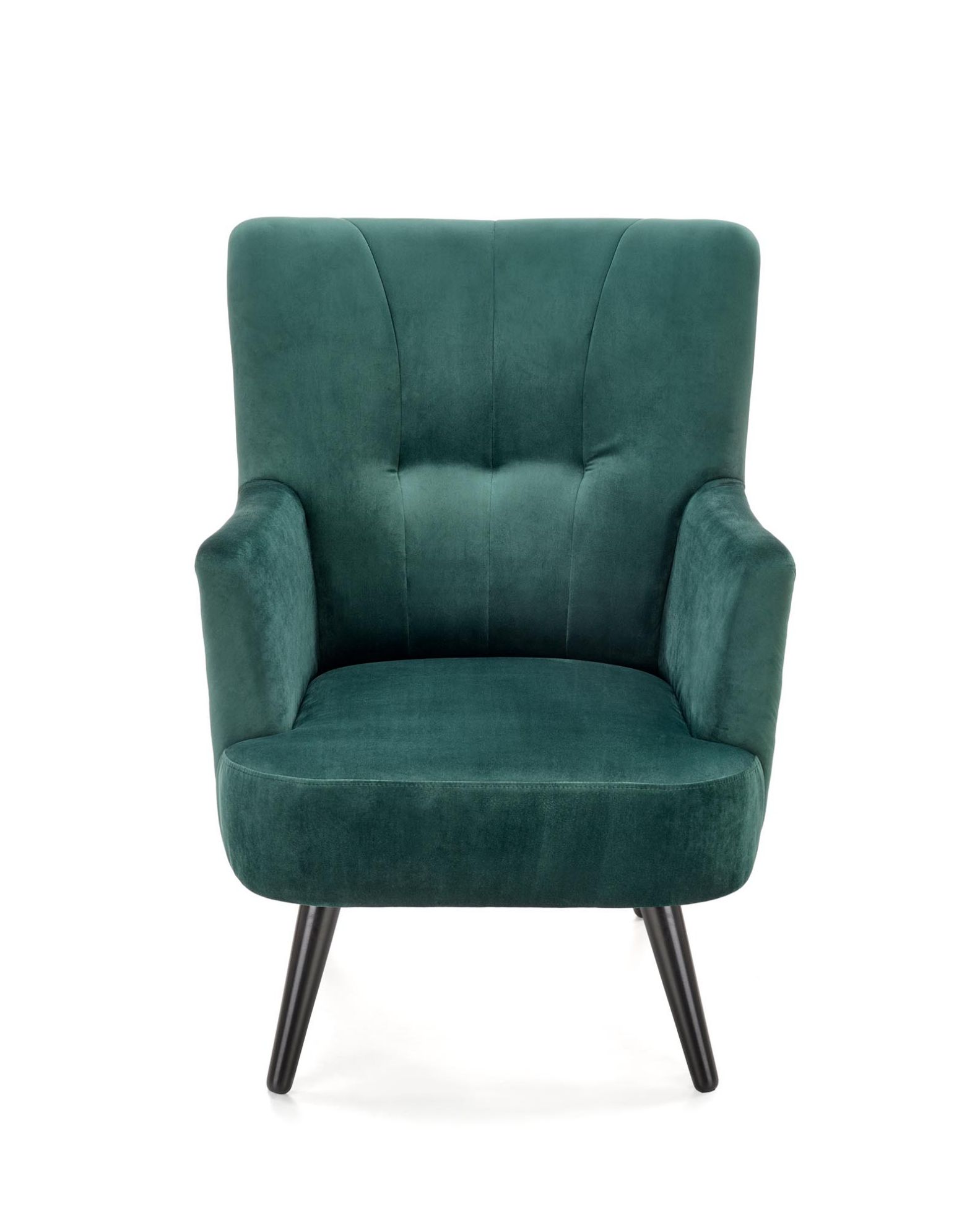 Nogi fotela zostały wykonane z trwałego drewna litego w kolorze czarnym. Kontrast między ciemnozieloną tapicerką a czarnymi nogami nadaje meblowi nowoczesny charakter i elegancję. Drewno lite zapewnia stabilność i trwałość fotela, dzięki czemu będzie on służyć przez wiele lat.