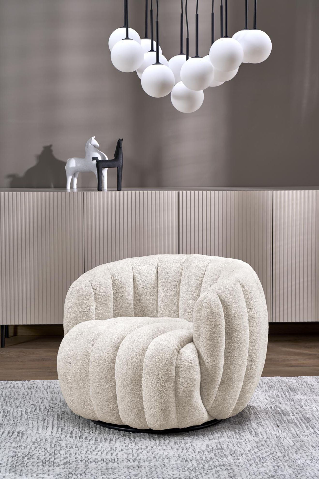 Fotel Frazma w kremowym kolorze łączy nowoczesny design z ergonomicznym siedziskiem. Tapicerka z wysokiej jakości tkaniny jest miękka i przyjemna w dotyku, oferując komfort podczas codziennego użytkowania. Jasny, kremowy kolor dodaje wnętrzu lekkości i elegancji.