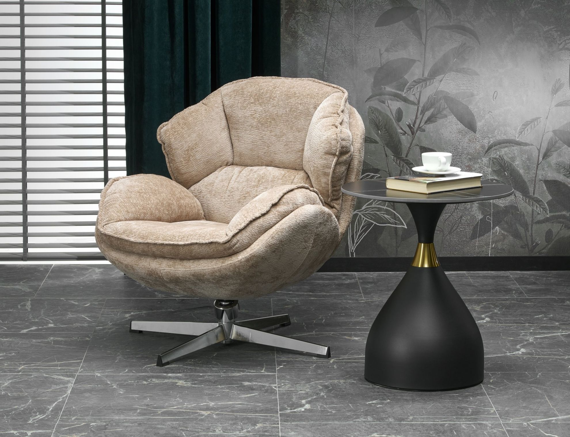 Solidna konstrukcja ze stali chromowanej dodaje fotelowi nowoczesnego wyglądu i gwarantuje trwałość oraz stabilność. Stal chromowana doskonale komponuje się z beżową tkaniną, tworząc harmonijne połączenie kolorystyczne.