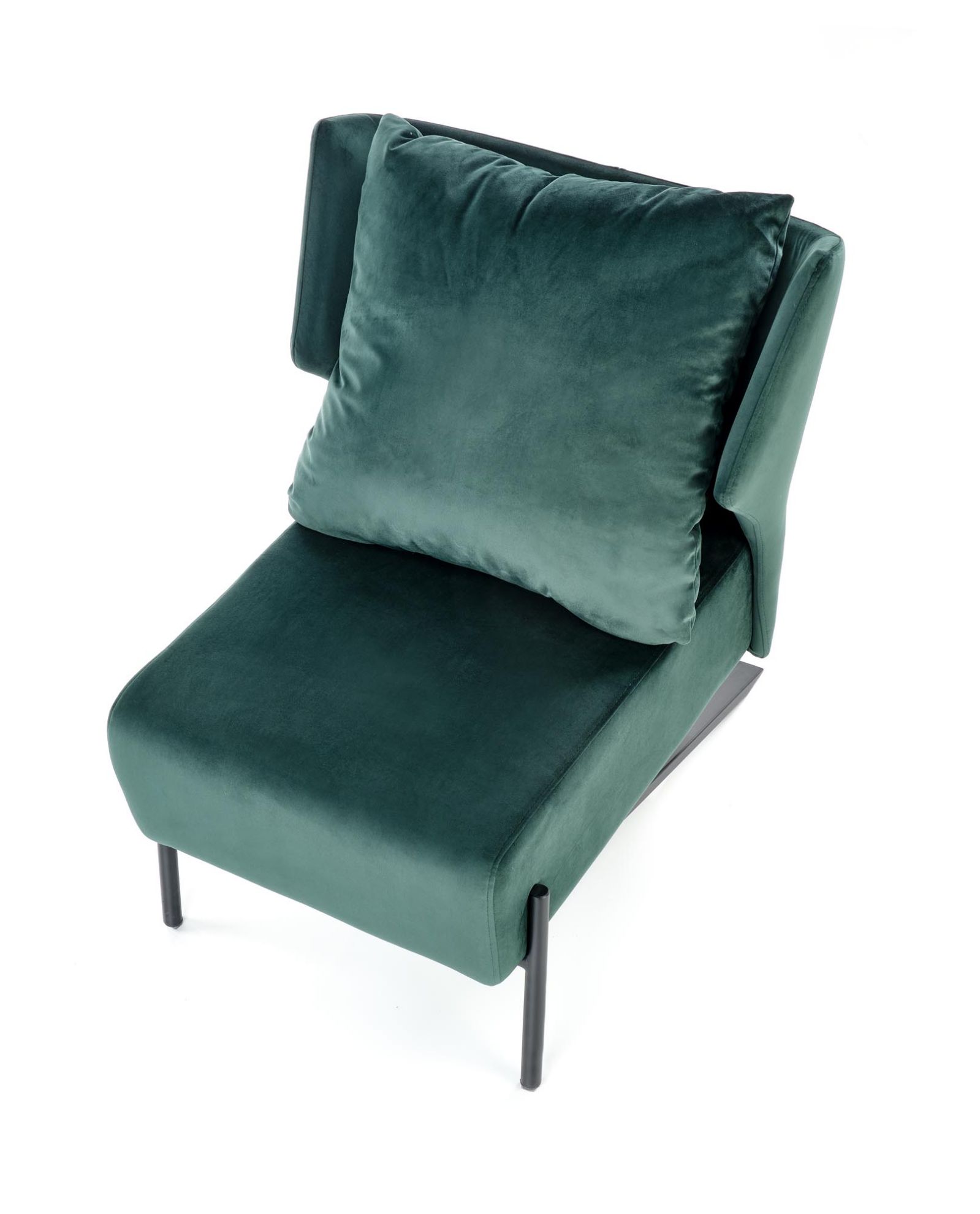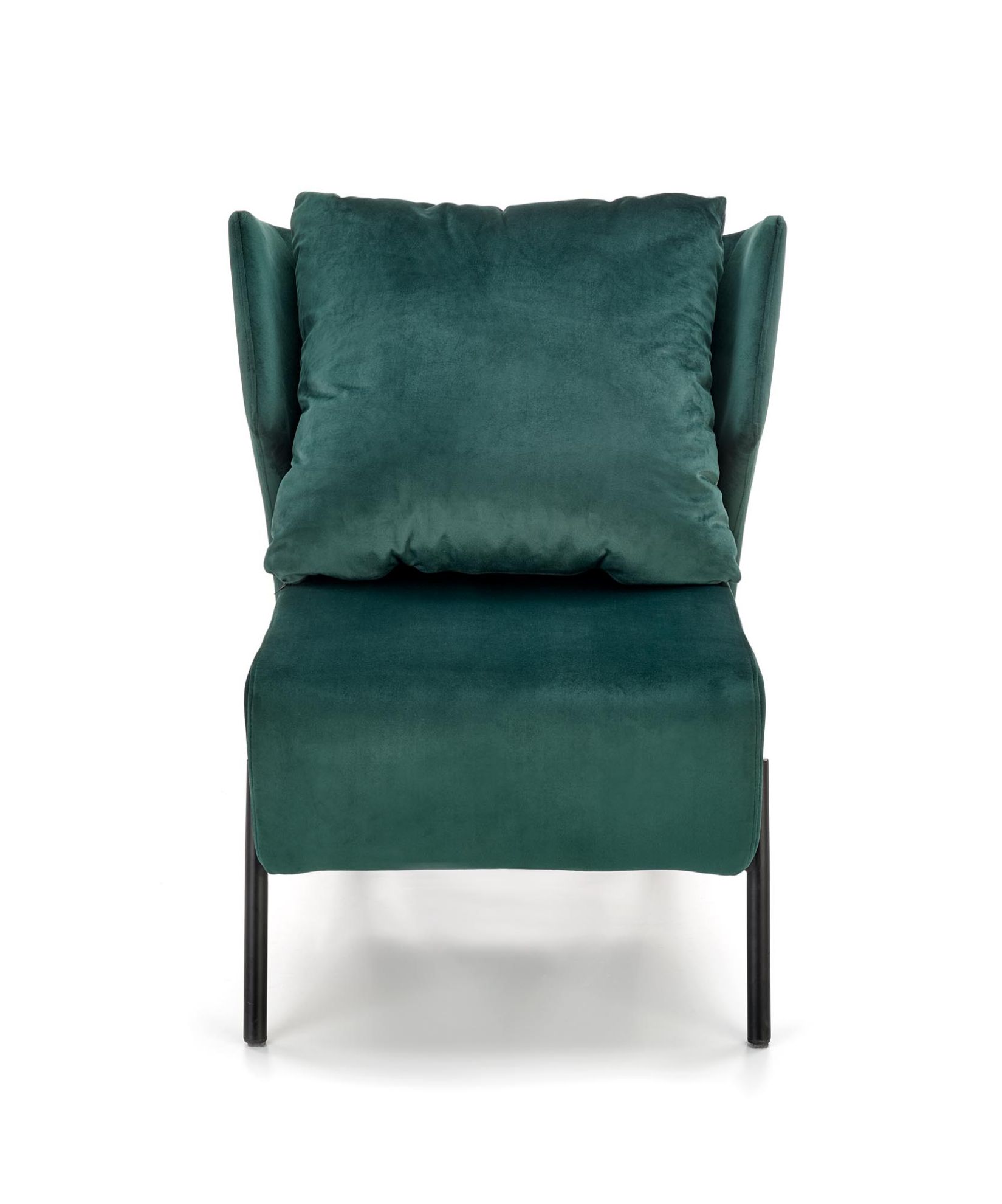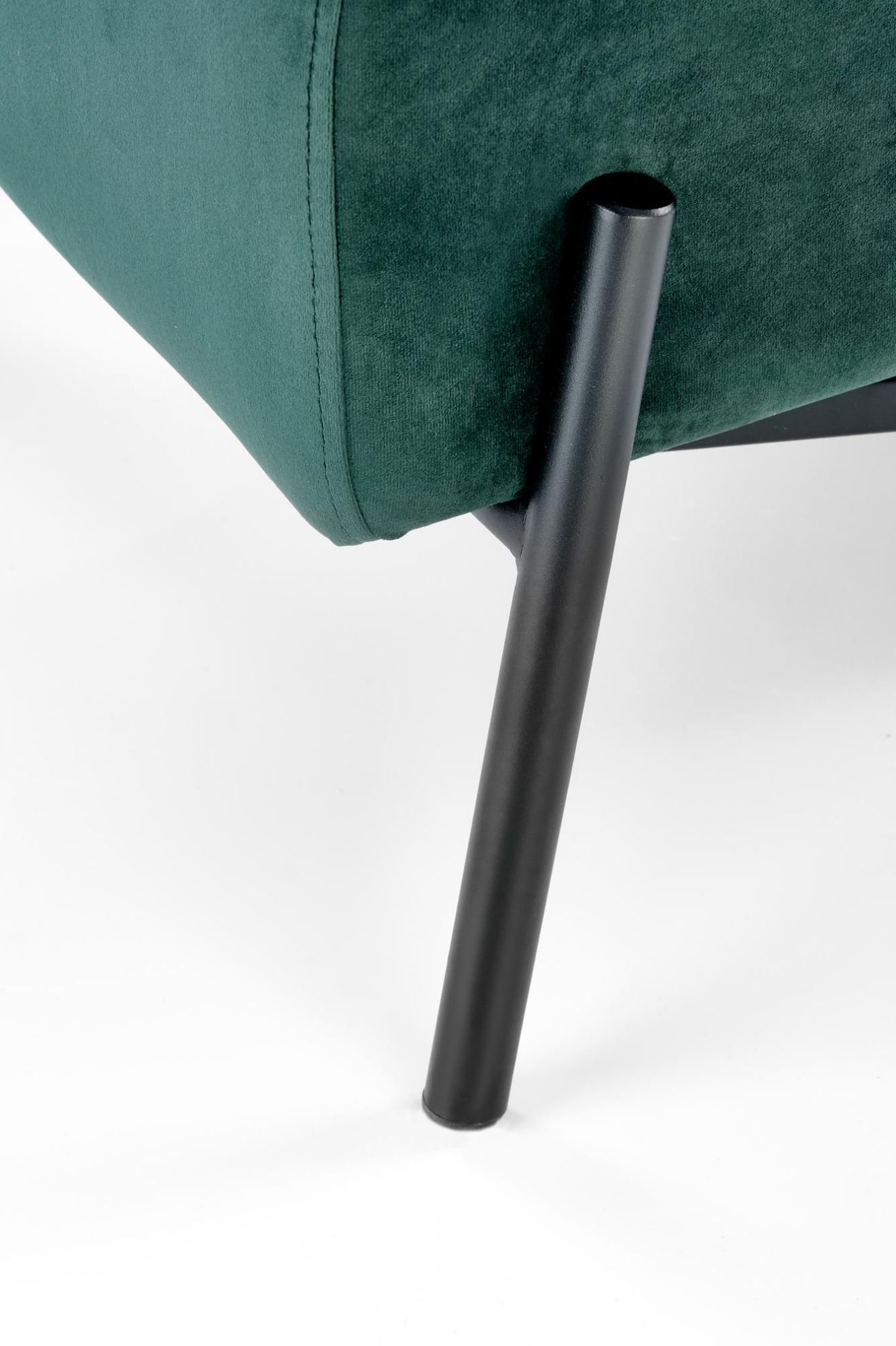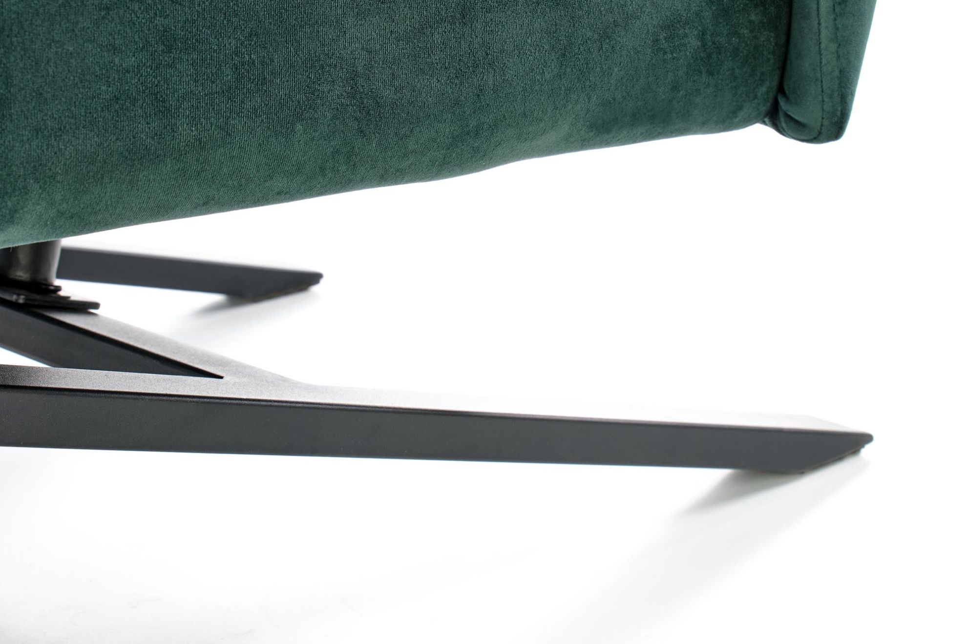 Nogi fotela zostały wykonane z solidnej stali malowanej proszkowo w kolorze czarnym. Stalowa konstrukcja jest trwała i stabilna, co sprawia, że fotel utrzymuje swoją formę przez wiele lat. Czarne nogi tworzą kontrast z ciemnozieloną tapicerką, nadając całemu fotelowi nowoczesnego charakteru.