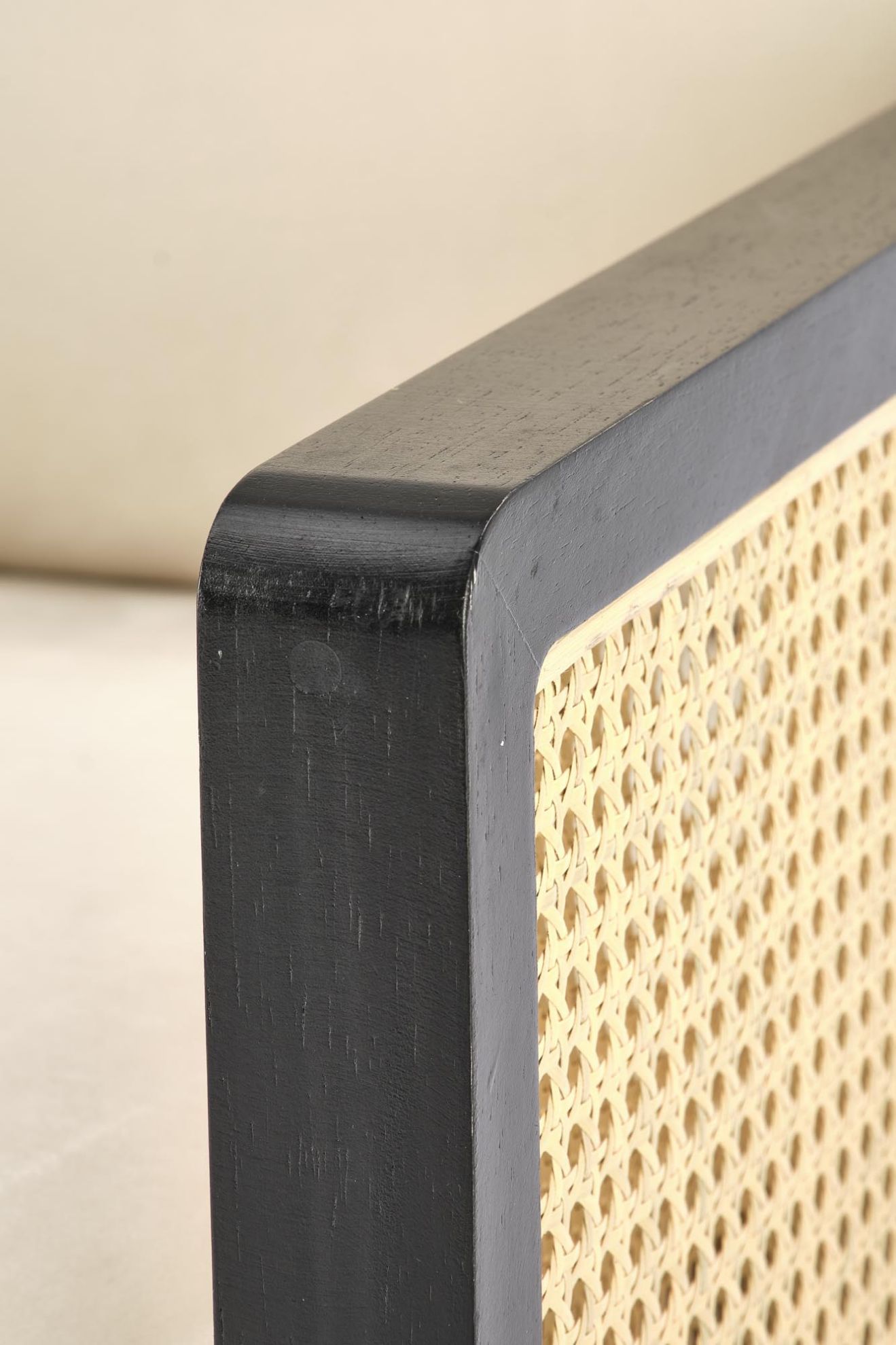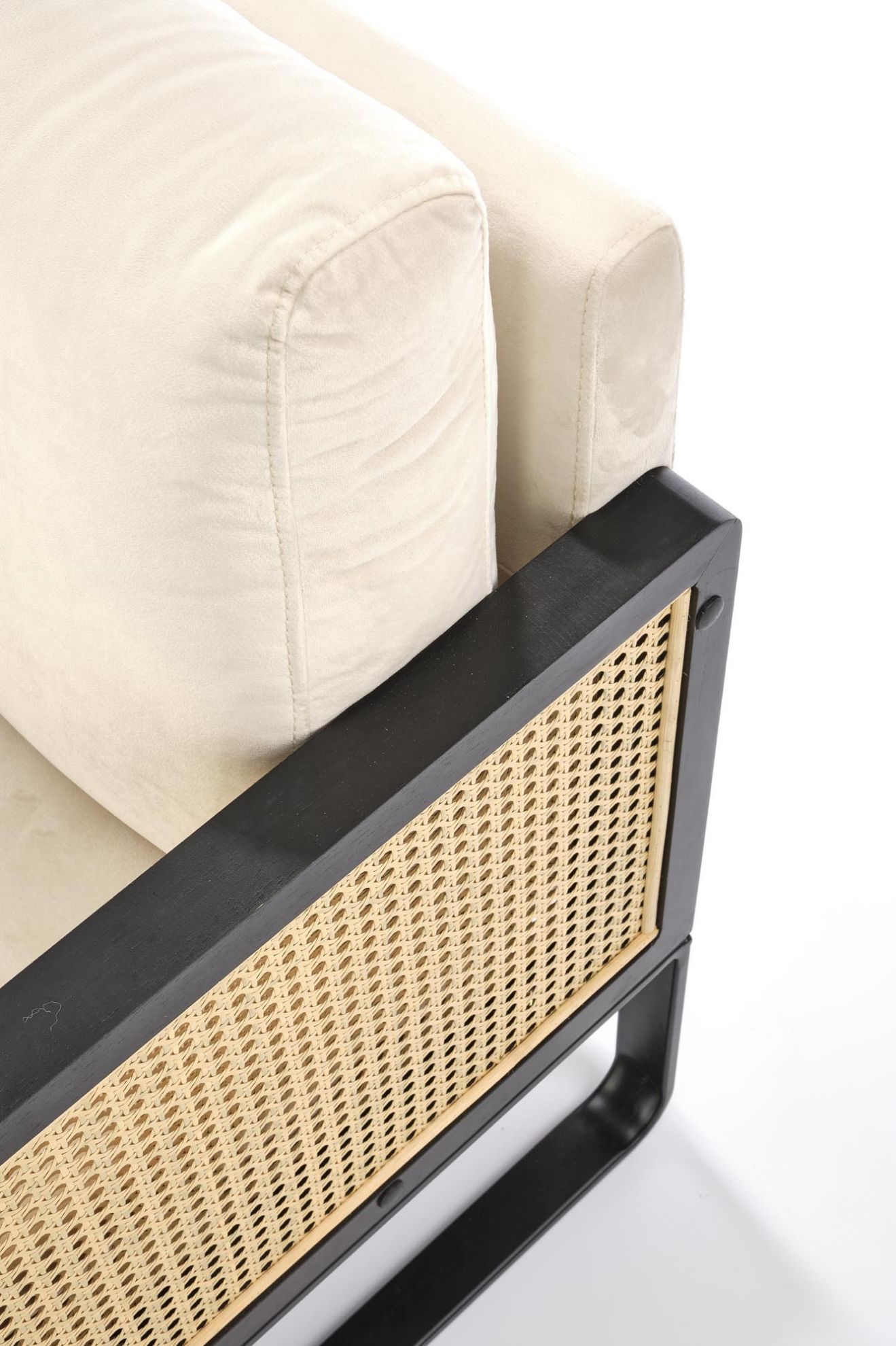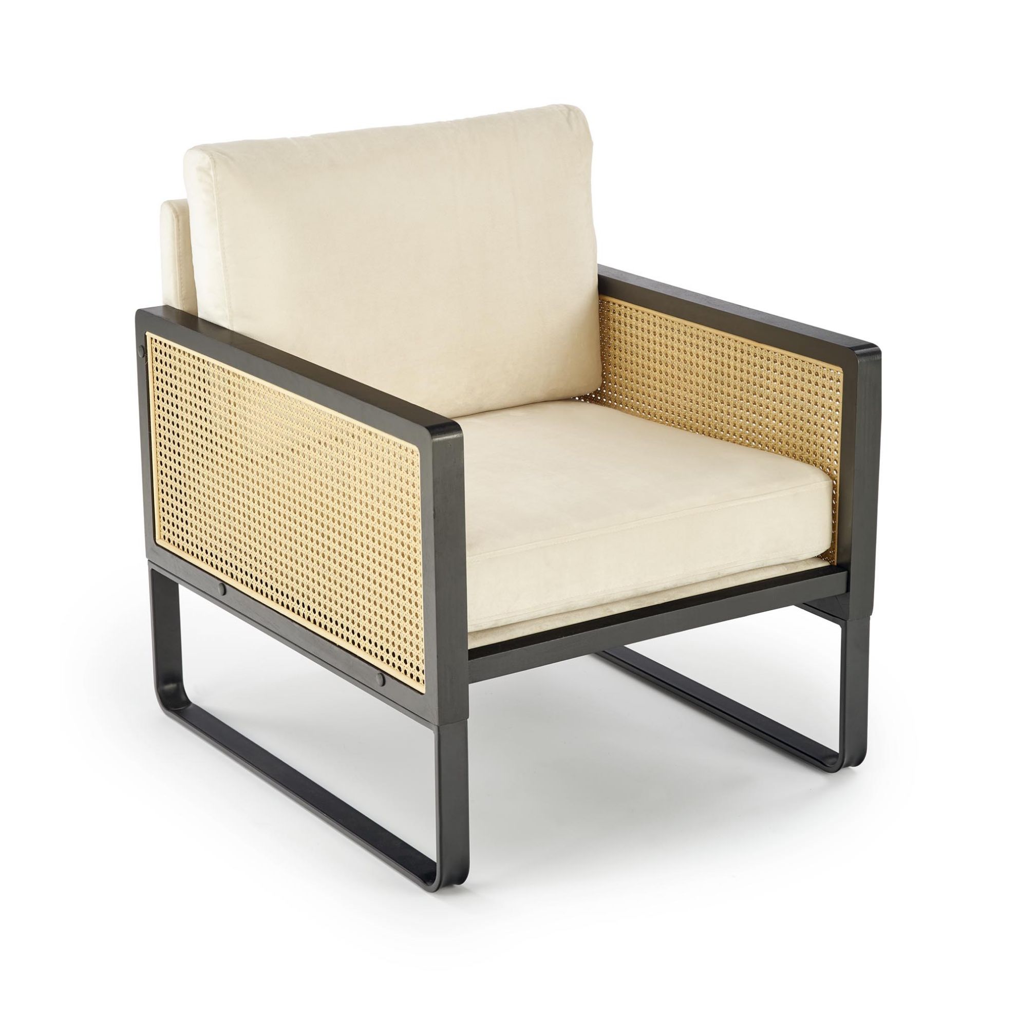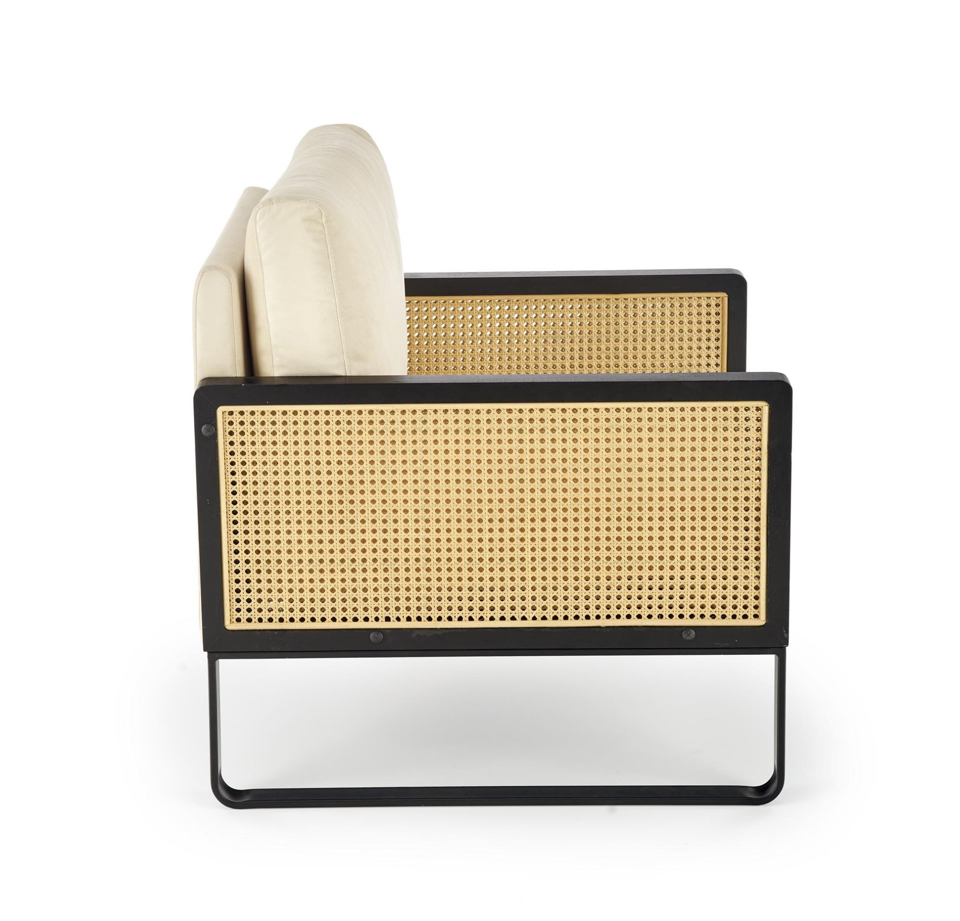 Konstrukcja fotela składa się z rattanu syntetycznego w naturalnym kolorze oraz solidnej stali malowanej proszkowo w czarnym odcieniu. Rattan syntetyczny dodaje meblowi egzotycznego uroku, a stalowa konstrukcja zapewnia trwałość i stabilność. Naturalne drewno lite, użyte na podłokietnikach lub innych elementach, wprowadza do mebla przytulny akcent.