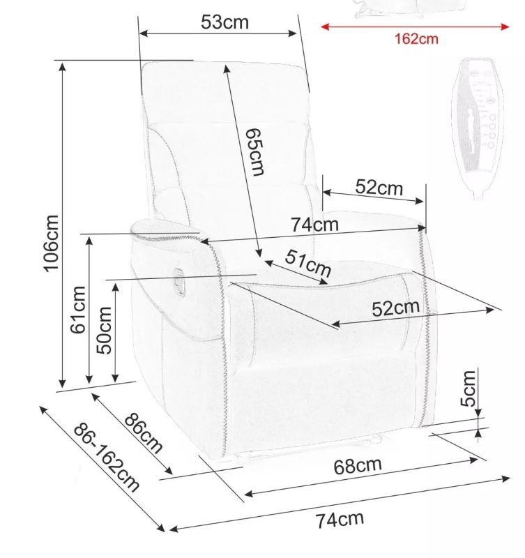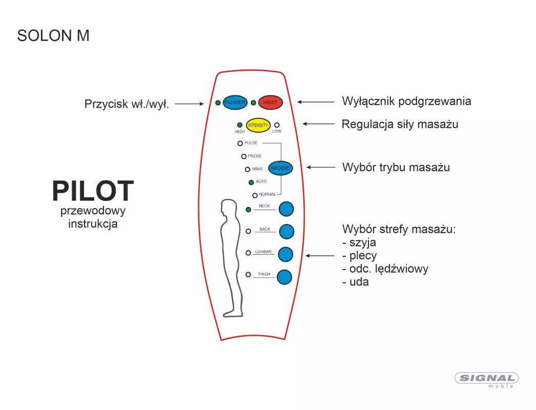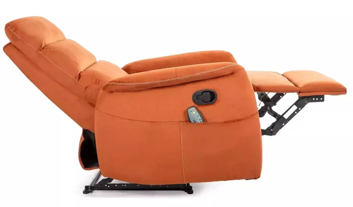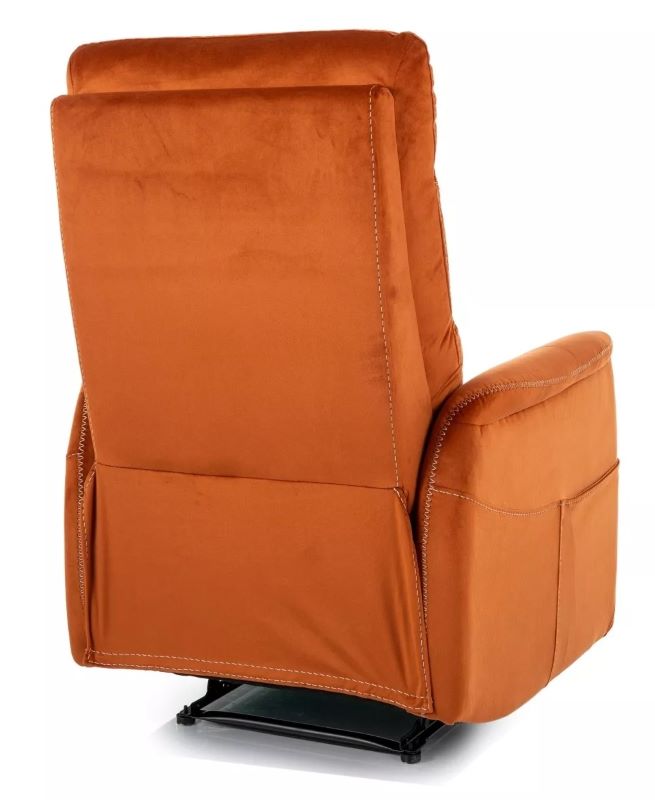 Fotel wypoczynkowy, rozkładany manualnie z funkcją masażu i podgrzewania, sterowanie za pomocą przewodowego pilota. Poziome pikowania na oparciu, ozdobne szwy w kontrastowej nici, zygzakowy szew na krawędzi boczków. Praktyczne kieszenie na bokach. Fotele wykonane w tkaninie Bluvel, tkanina ta jest wolna od substancji niebezpiecznych dla zdrowia i środowiska, jest bezpieczna w użytkowaniu. Jest odporna na źródło zapłonu. Dodatkowo tkanina Bluvel jest odporna na zaciąganie przez pazurki zwierząt. Maksymalne obciążenie 150 kg.