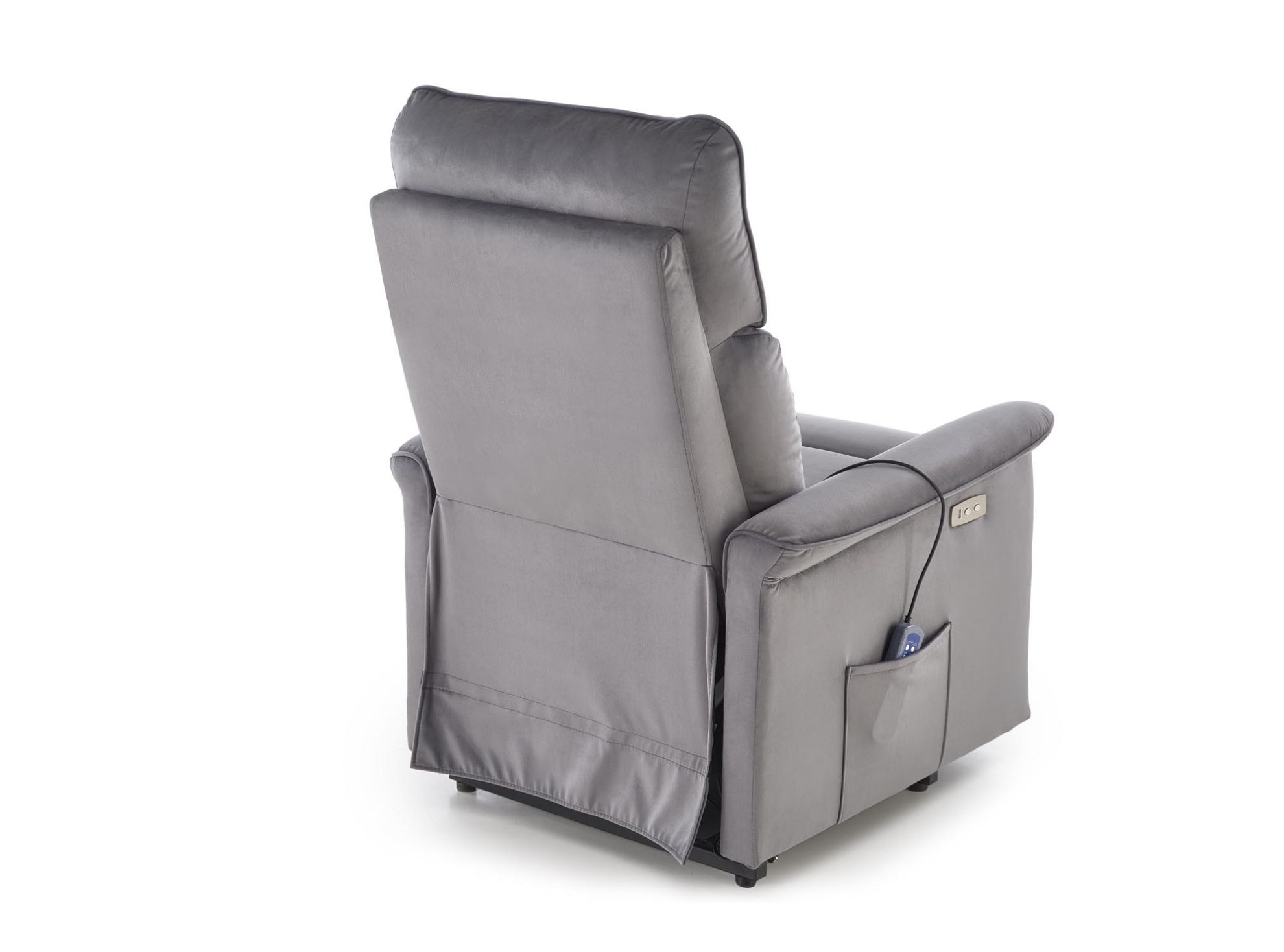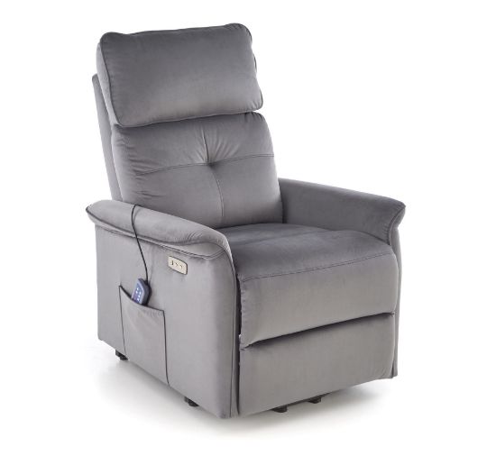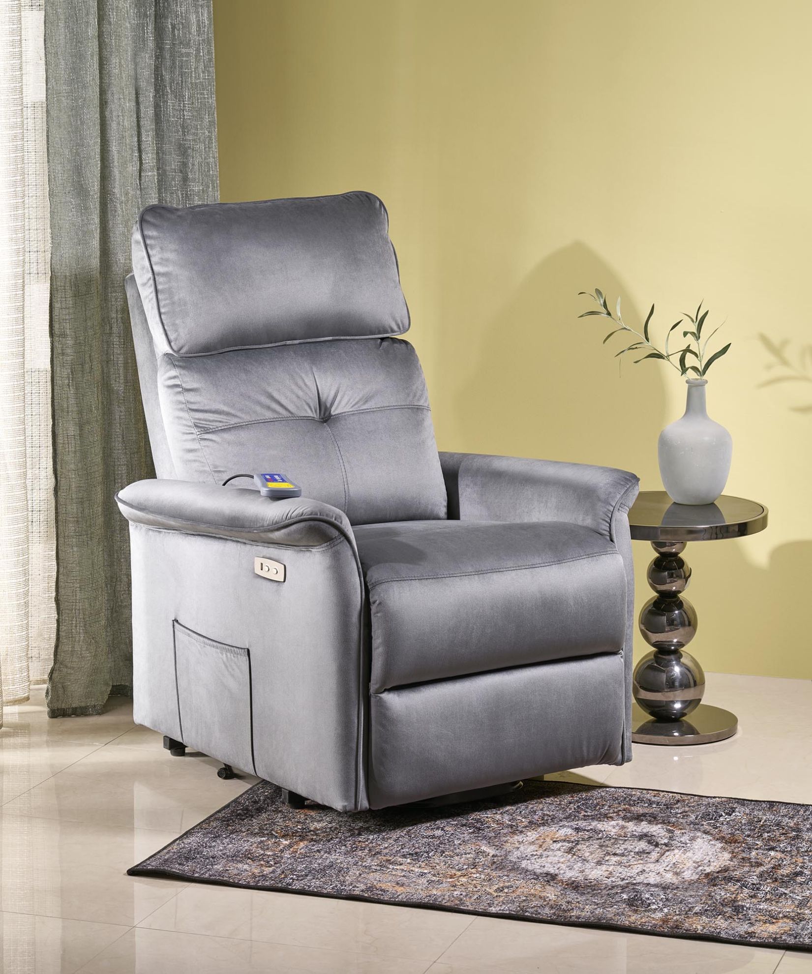 Fotel SEMIR 2 wyposażono w elektryczną funkcję rozkładania, dzięki której można łatwo dostosować pozycję oparcia i podnóżka. Funkcja masażu pozwala na relaks całego ciała i redukcję napięcia mięśni, natomiast funkcja pionizacji wspomaga bezpieczne wstawanie. Dodatkowym udogodnieniem jest wbudowane gniazdo USB, umożliwiające ładowanie urządzeń bezpośrednio przy fotelu.
