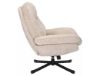 Fotel w eleganckim kolorze beżowym (tkanina tap. nr 241). Przód oparcia zdobią subtelne przeszycia, a tył pozostaje gładki, tapicerowany tą samą tkaniną. Dodatkowym akcentem są zygzakowe szwy kontrastującą nicią na krawędziach kubełka oraz delikatne szwy na rąbkach poduch siedziska i oparcia, co nadaje fotelowi wyjątkowego charakteru.