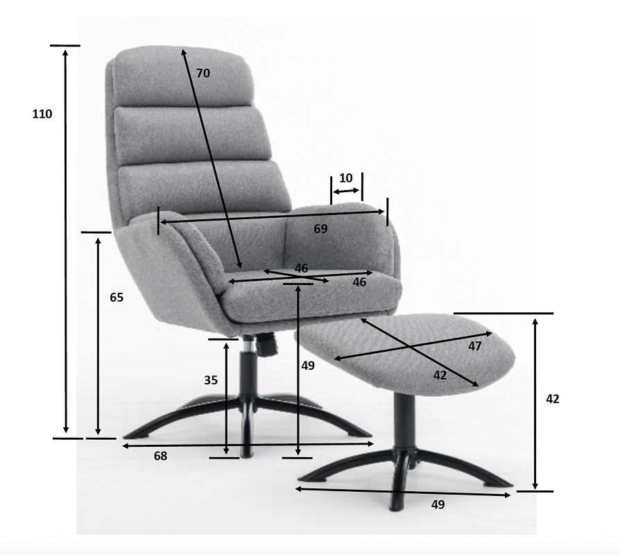 Oparcie z eleganckim poziomym pikowaniem nadaje meblowi nowoczesnego i stylowego charakteru, co sprawia, że fotel idealnie wpisuje się w wystrój każdego wnętrza. Zintegrowany podnóżek zapewnia dodatkowe wsparcie dla nóg, dzięki czemu fotel ten to nie tylko funkcjonalny element wyposażenia, ale również prawdziwa oaza relaksu. Wymiary podnóżka: 49x42x42 cm.