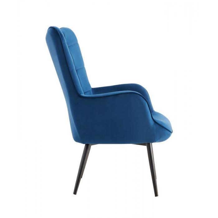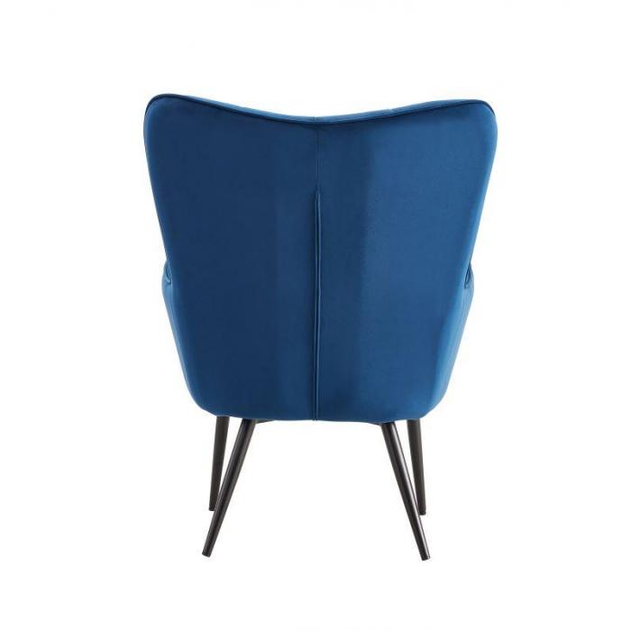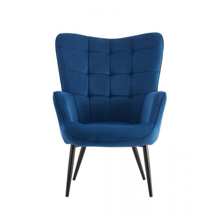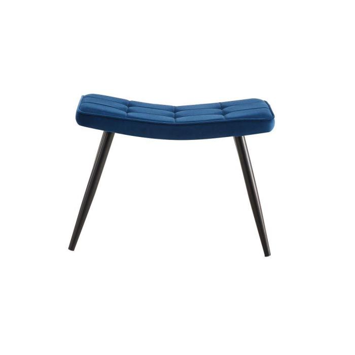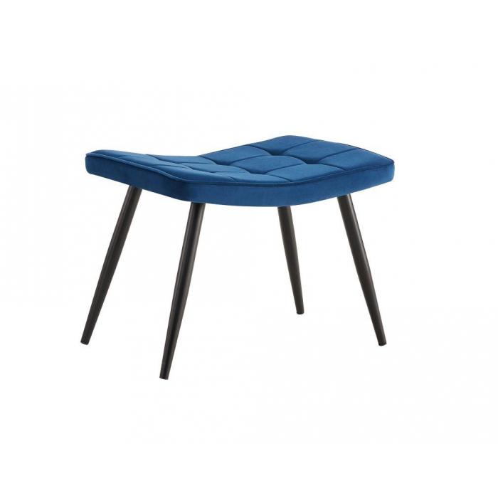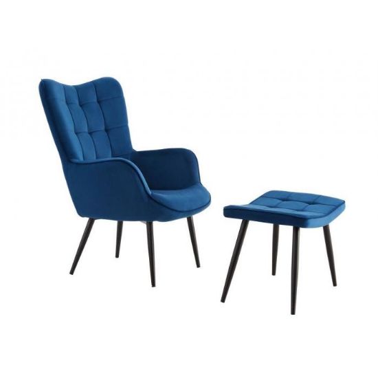 Fotel z podnóżkiem Timo dostępny w kolorze granatowym, tapicerowany tkaniną aksamitną, welurową. Tkanina ta jest sprężysta, miękka i delikatna w dotyku. Dzięki niezwykłej fakturze oraz połyskowi zapewnia idealny komfort i wygląda luksusowo. Ponadto tkanina nie gniecie się łatwo, jest mięsista, nie prześwituje i szybko schnie. To mocna i wytrzymała tkanina, która jest odporna na rozrywanie i rozciąganie. Jako element dekoracyjny zostały zastosowane ozdobne przeszycia i wciągi. Nóżki metalowe malowane proszkowo. Siedzisko fotela jak i podnóżka wypełnione pianką.