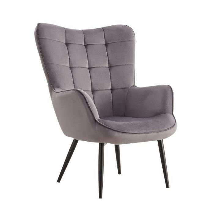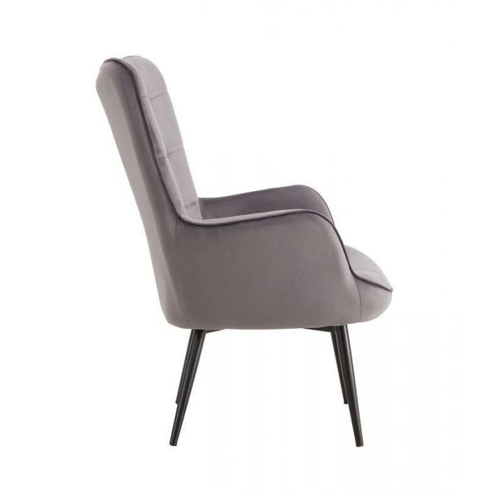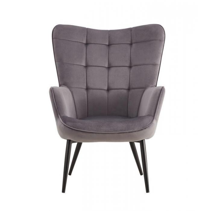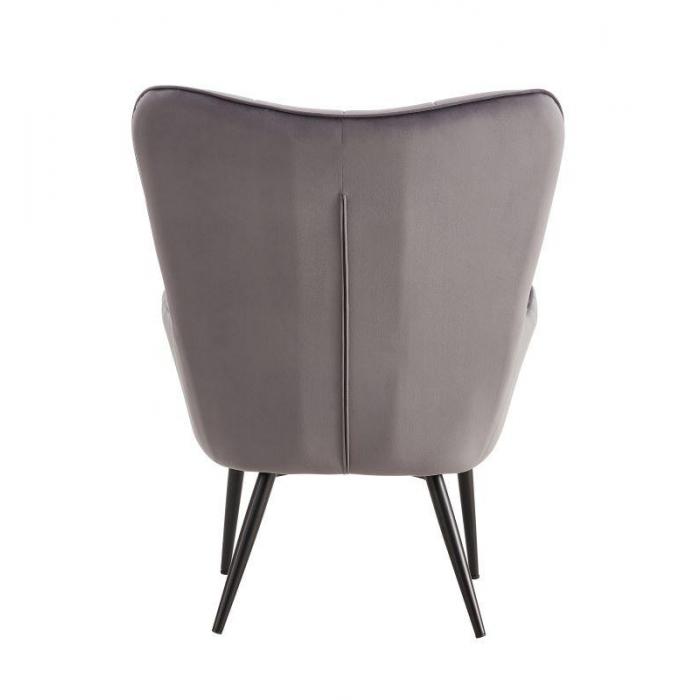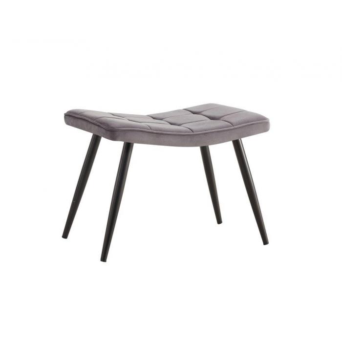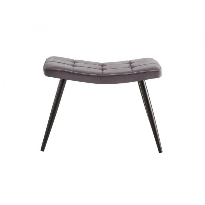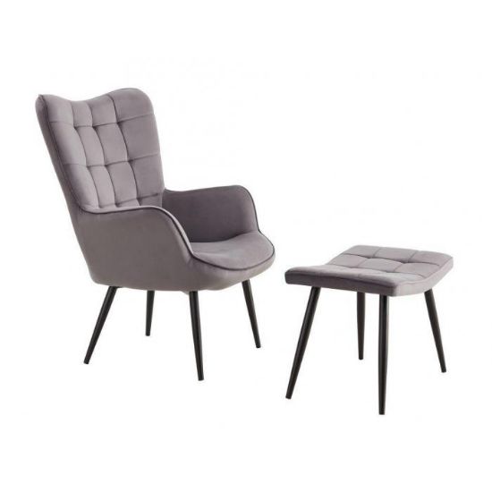 Fotel z podnóżkiem Timo dostępny w kolorze szarym, tapicerowany tkaniną aksamitną, welurową. Tkanina ta jest sprężysta, miękka i delikatna w dotyku. Dzięki niezwykłej fakturze oraz połyskowi zapewnia idealny komfort i wygląda luksusowo. Ponadto tkanina nie gniecie się łatwo, jest mięsista, nie prześwituje i szybko schnie. To mocna i wytrzymała tkanina, która jest odporna na rozrywanie i rozciąganie. Jako element dekoracyjny zostały zastosowane ozdobne przeszycia i wciągi. Nóżki metalowe malowane proszkowo. Siedzisko fotela jak i podnóżka wypełnione pianką.