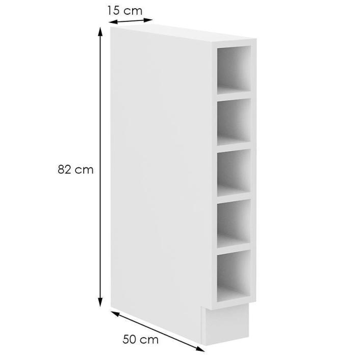 Model 15D OTW BB o szerokości 15 cm, głębokości 50 cm i wysokości 82 cm oferuje praktyczne miejsce do przechowywania przypraw, drobnych akcesoriów kuchennych lub dekoracji. Otwarta półka umożliwia szybki dostęp do przechowywanych przedmiotów, co ułatwia organizację kuchni i dodaje wnętrzu lekkości.