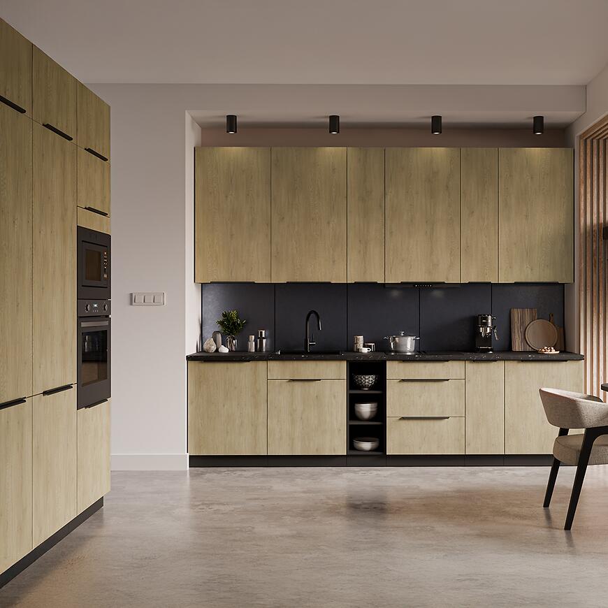 Model Cremona został zaprojektowany jako front do zmywarki, co pozwala zachować spójny wygląd całej zabudowy kuchennej. Dzięki temu wszystkie elementy mebli tworzą harmonijną całość, podkreślając estetykę pomieszczenia. Dodatkowym akcentem jest cokół w kolorze czarnym, który nadaje całości elegancki kontrast i podkreśla nowoczesną linię kuchni.