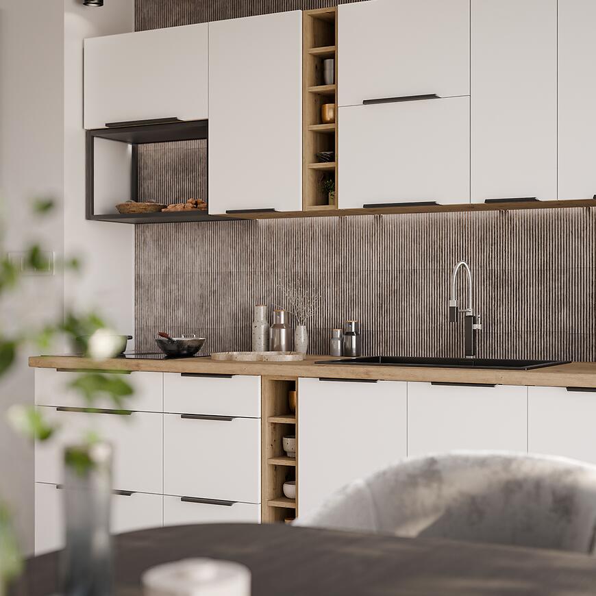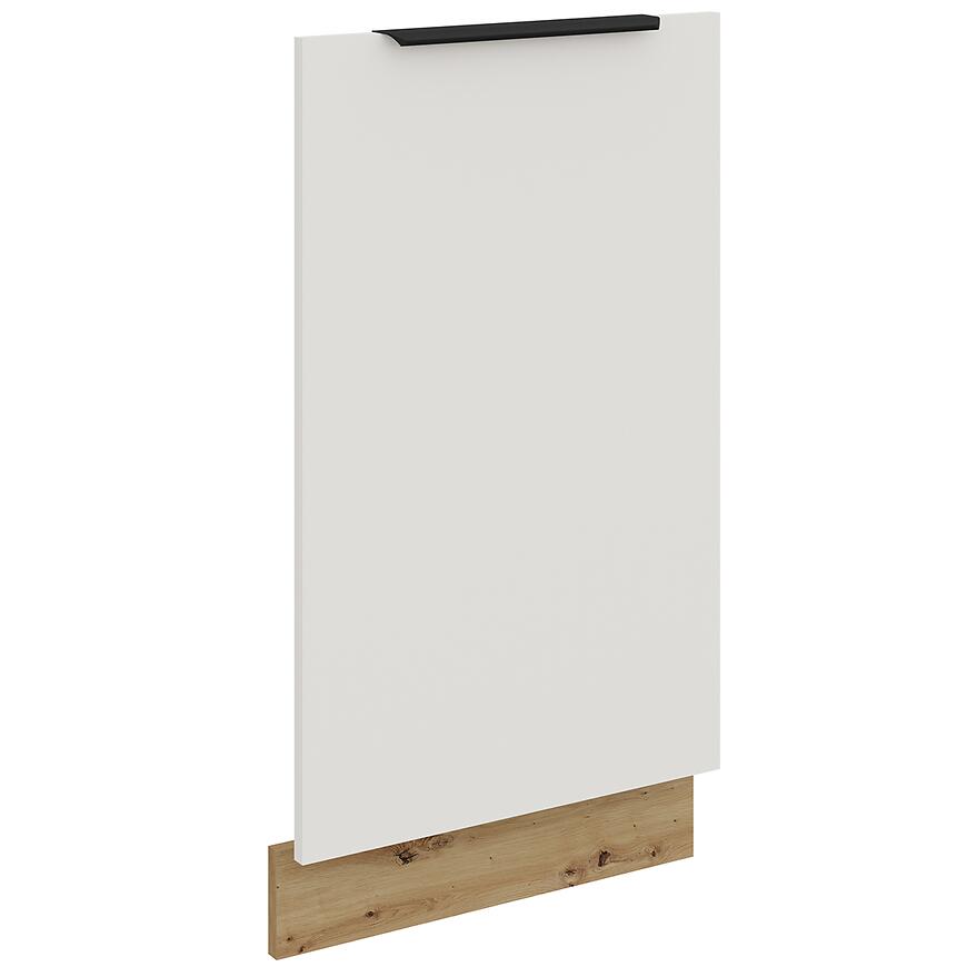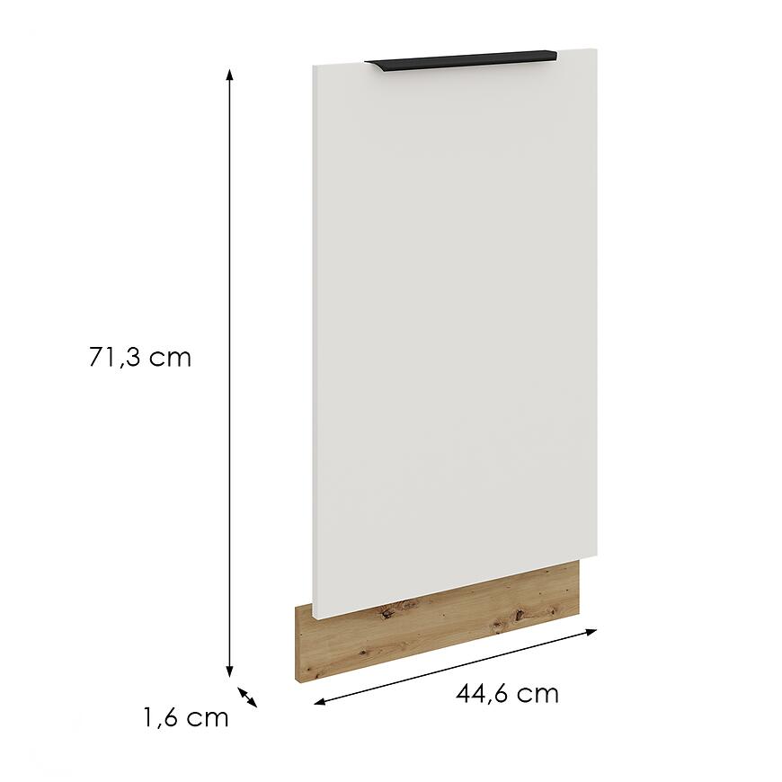 W konstrukcji zastosowano płytę wiórową laminowaną, zapewniającą wytrzymałość, stabilność oraz odporność na codzienne użytkowanie. To front dedykowany do zmywarki, idealnie komponujący się z zabudową kuchenną w stylu nowoczesnym i minimalistycznym. Dolne fronty w białym wybarwieniu oraz cokół dopasowany do korpusu w dekorze dąb artisan sprawiają, że całość tworzy spójny i estetyczny zestaw.