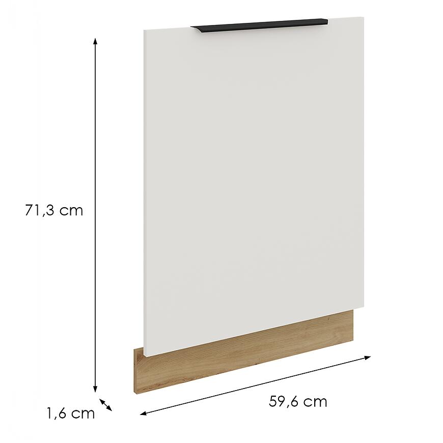 W konstrukcji zastosowano płytę wiórową laminowaną, zapewniającą wytrzymałość, stabilność oraz odporność na codzienne użytkowanie. To front dedykowany do zmywarki, idealnie komponujący się z zabudową kuchenną w stylu nowoczesnym i minimalistycznym. Dolne fronty w białym wybarwieniu oraz cokół dopasowany do korpusu w dekorze dąb artisan sprawiają, że całość tworzy spójny i estetyczny zestaw.