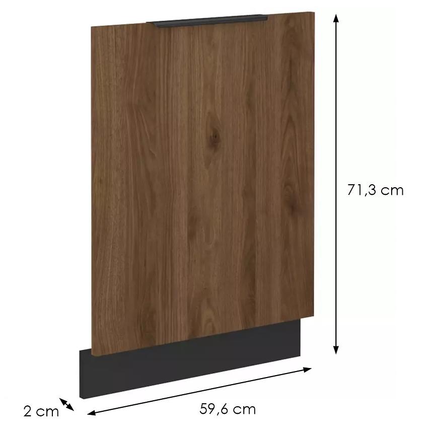 Konstrukcja frontów oparta jest na solidnej płycie wiórowej laminowanej, co gwarantuje trwałość mebla oraz odporność na uszkodzenia, jednocześnie utrzymując naturalny wygląd drewna orzecha okapi.