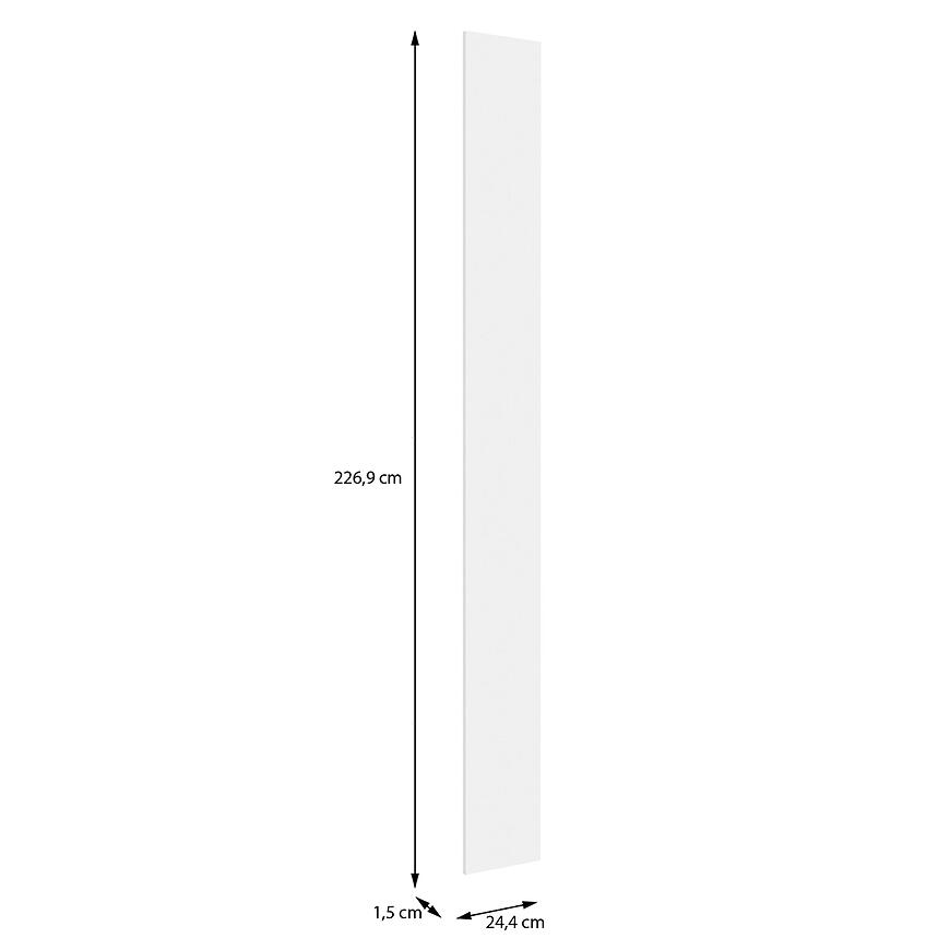 Front ma 24,4 cm szerokości, 226,9 cm wysokości i 1,5 cm głębokości, zapewniając estetyczne i funkcjonalne wykończenie wysokiej szafy. Wykonany z płyty wiórowej laminowanej, łączy trwałość z lekką konstrukcją, a waga 5,3 kg ułatwia montaż i transport.