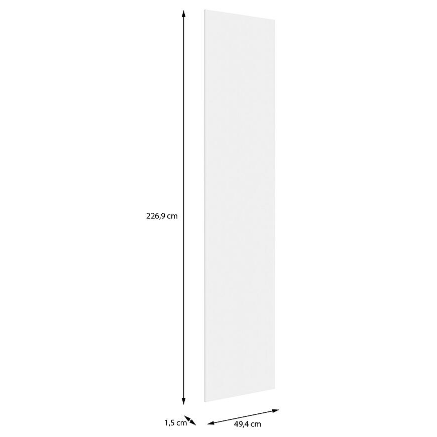 Front ma 49,4 cm szerokości, 226,9 cm wysokości i 1,5 cm głębokości, co zapewnia estetyczne i funkcjonalne wykończenie wysokiej szafy. Wykonany z płyty wiórowej laminowanej, łączy trwałość z lekką konstrukcją, a waga 11 kg ułatwia montaż i transport.