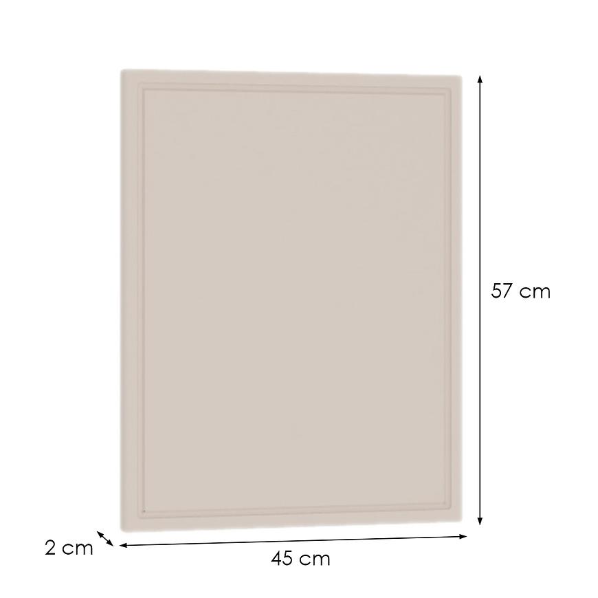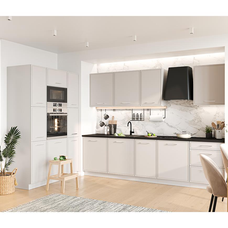 Front zmywarki, utrzymany w delikatnym odcieniu beżowym, tworzy kontrastowy, a zarazem stonowany kontrast, który podkreśla nowoczesny design mebla. Cokół w kolorze korpusu dodaje wyjątkowego charakteru i podkreśla spójność całości.