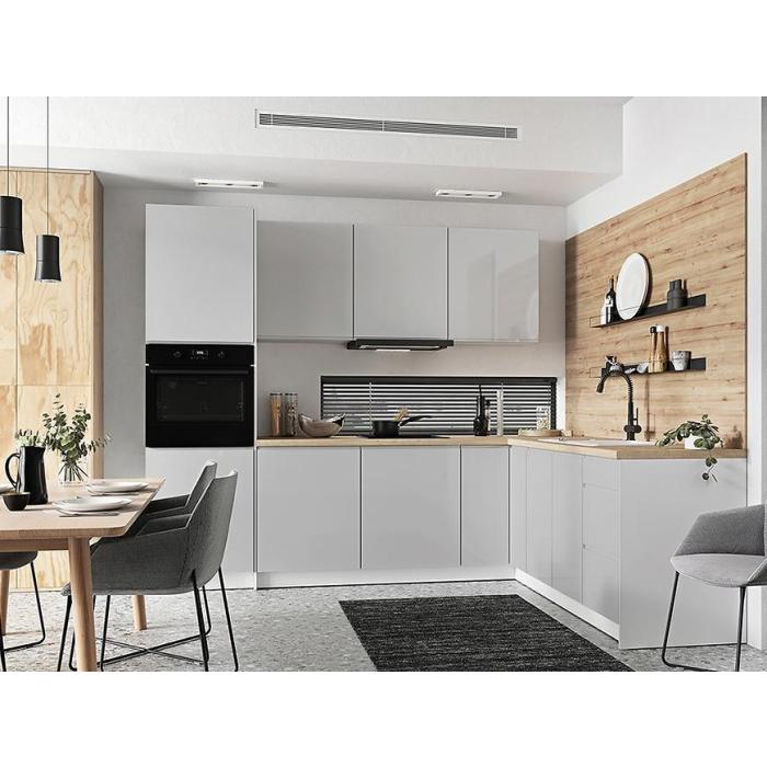 Kolekcja mebli kuchennych Livia w kolorze frontu jasnym szarym z matowym wykończeniem, korpus biały mat idealnie wpisze się w aranżację pomieszczeń w stylu minimalistycznym i nowoczesnym. Kolekcja dostępna jest w kolorach biały połysk, szary, dąb tajga.
