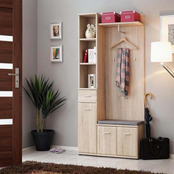 Garderoba Armario I sonoma to idealne rozwiązanie do przedpokoju. System składa się z wąskiego słupka, szafki z siedziskiem i panela wieszakowego.