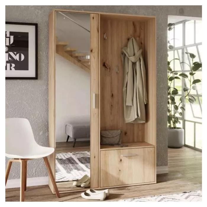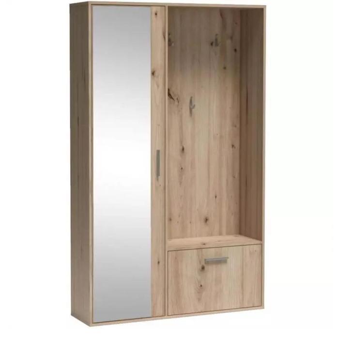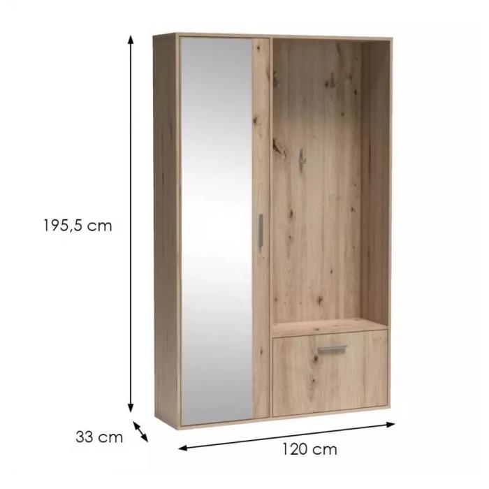 Garderoba Bis z lustrem. We wnęce na zewnętrznej stronie posiada trzy wieszaki, idealne na kurtki, płaszcze czy bluzy i torebki. Poniżej znajduje się szafka na buty z przegrodą, co ułatwia organizacje. Szafa po lewej stronie posiada w sobie dwie półki. Jedną do góry a drugą na dole, pozwala to na umieszczenie na nich rzeczy, które wymagają położenia na płaskiej powierzchni. Nowoczesną opcją jest wysuwany wieszak, uwydatniający unikalność i funkcjonalność szafy.