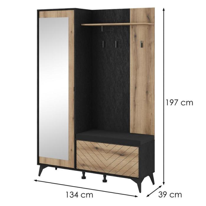 Zestaw zawiera panel z szafką i wieszaki oraz szafę z lustrem z półkami. Dzięki, którym zyskamy łatwo dostępną przestrzeń do przechowywania rzeczy, ubrań i butów.