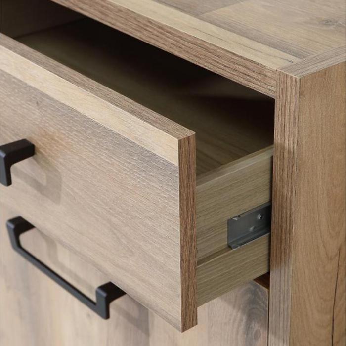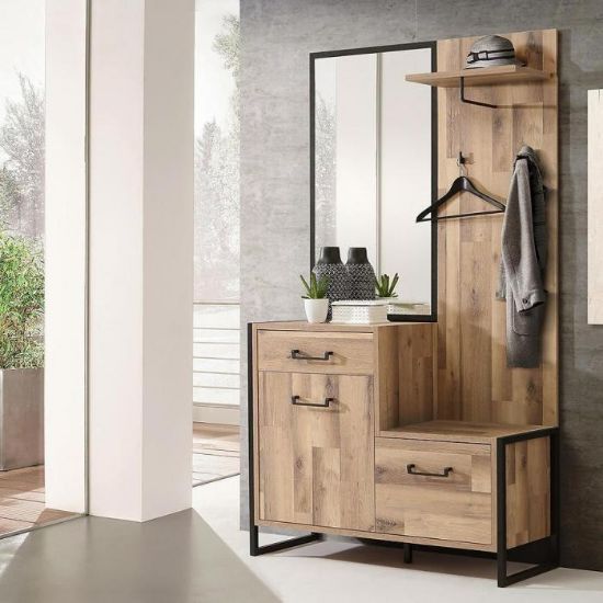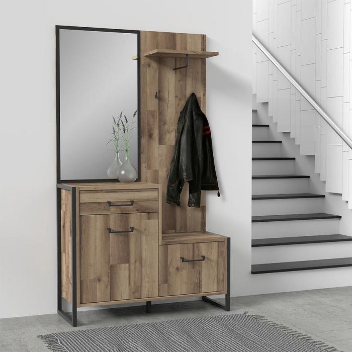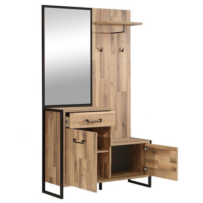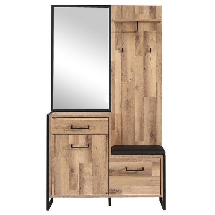 Zaaranżuj swój przedpokój i podstaw na uporządkowaną przestrzeń! Kolekcja Hud to nowoczesne i stylowe meble do przedpokoju wykonanych z wysokiej jakości materiałów. Całość świetnie sie prezentuje - wyraźny motyw dębowych klepek nie tylko tworzy ciekawy wizualnie element, ale delikatnie maskuje drobne zabrudzenia. Konstrukcja wsparta jest na czarnych płozach, które nie tylko zapewniają stabilność, ale są także świetnym elementem dekoracyjnym wraz z czarnymi uchwytami i haczykami. Regał będzie świetnie prezentował się w nowoczesnych, loftowych wnętrzach. Projekt został bardzo dobrze przemyślany. Znajdzie się tu miejsce by położyć kapelusz, zawiesić płaszcz czy schować buty.