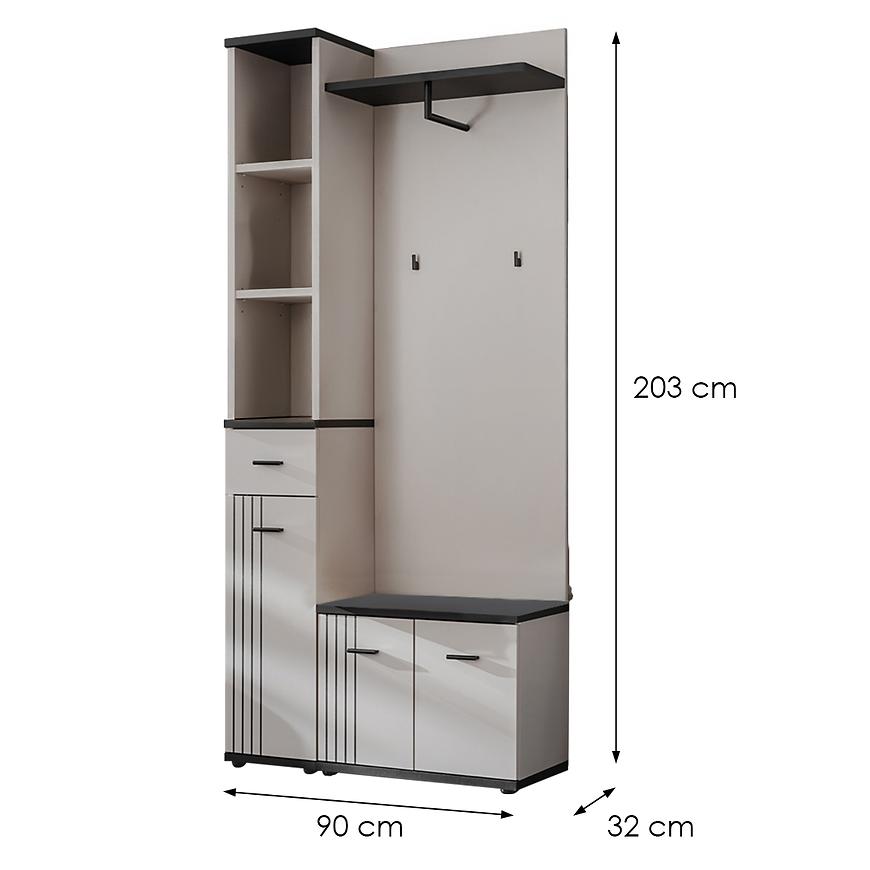 Nowoczesna garderoba Hugo I z kolekcji HUGO to funkcjonalne i stylowe rozwiązanie do przedpokoju lub holu. Wymiary 203x90x32 cm zapewniają kompaktowość przy jednoczesnej dużej pojemności. Wykonana z laminowanej płyty wiórowej w matowym wykończeniu. Korpus w kolorze kaszmiru oraz kontrastowe fronty kaszmir/czarny nadają meblowi elegancki, nowoczesny charakter. Garderoba stojąca, wymaga samodzielnego montażu. Idealna do wnętrz ceniących minimalizm i funkcjonalność.