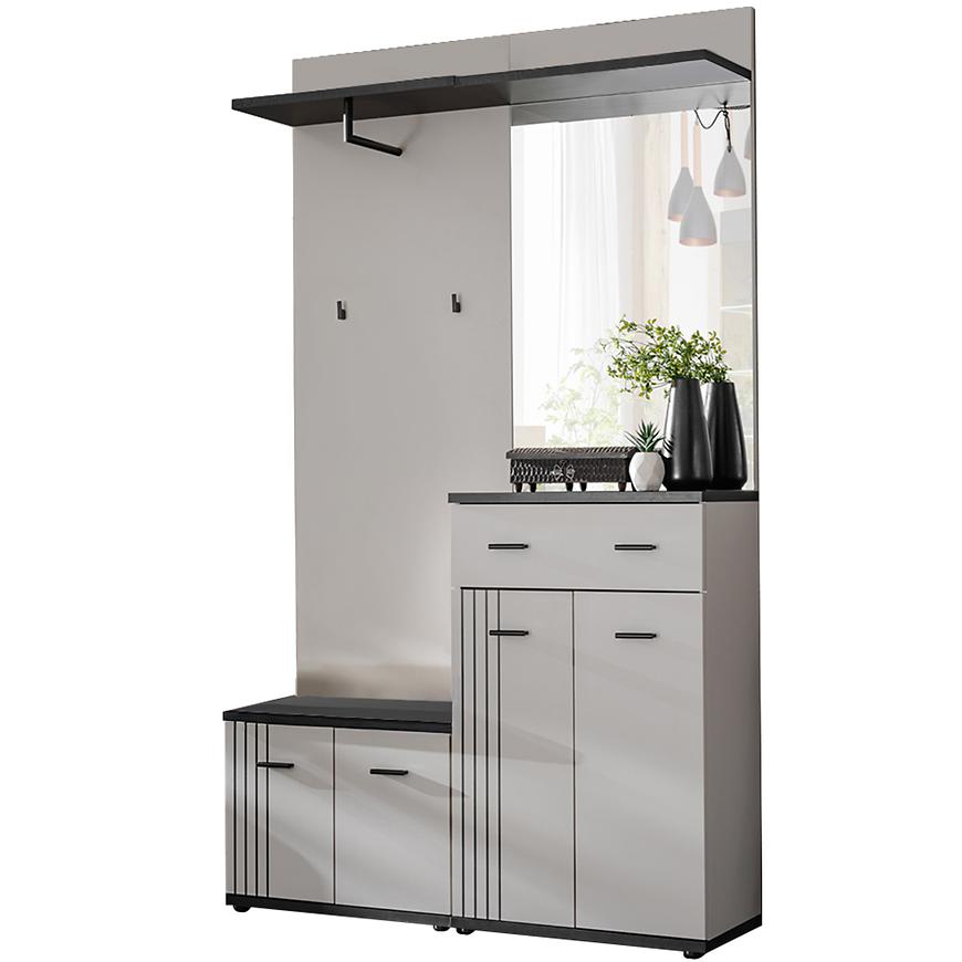Zestaw obejmuje funkcjonalne elementy – szafę z lustrem, wieszak, szafkę na buty oraz lustro w czarnej ramie. Każdy mebel został wykonany z solidnych materiałów, co gwarantuje trwałość i komfort użytkowania na lata.