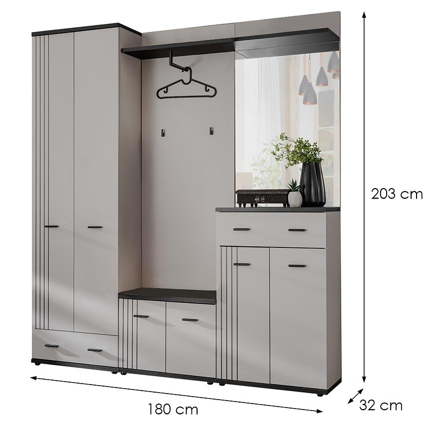 Garderoba Hugo III z kolekcji HUGO to przestronny i nowoczesny mebel o wymiarach 203x180x32 cm, idealny do dużych przedpokojów. Wykonana z laminowanej płyty wiórowej w matowym wykończeniu, łączy trwałość z estetyką. Połączenie koloru kaszmir i czarnych akcentów nadaje całości elegancki, nowoczesny charakter. Garderoba stojąca, wymaga samodzielnego montażu. Zapewnia dużą ilość miejsca do przechowywania, jednocześnie zachowując lekkość formy i ponadczasowy wygląd.