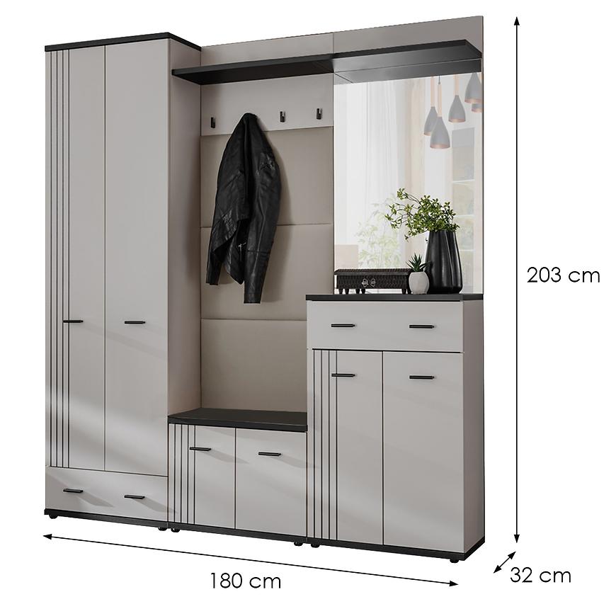 Zestaw obejmuje funkcjonalne elementy – szafę z lustrem, wieszak, szafkę na buty oraz lustro w czarnej ramie. Każdy mebel został wykonany z solidnych materiałów, co gwarantuje trwałość i komfort użytkowania na lata.