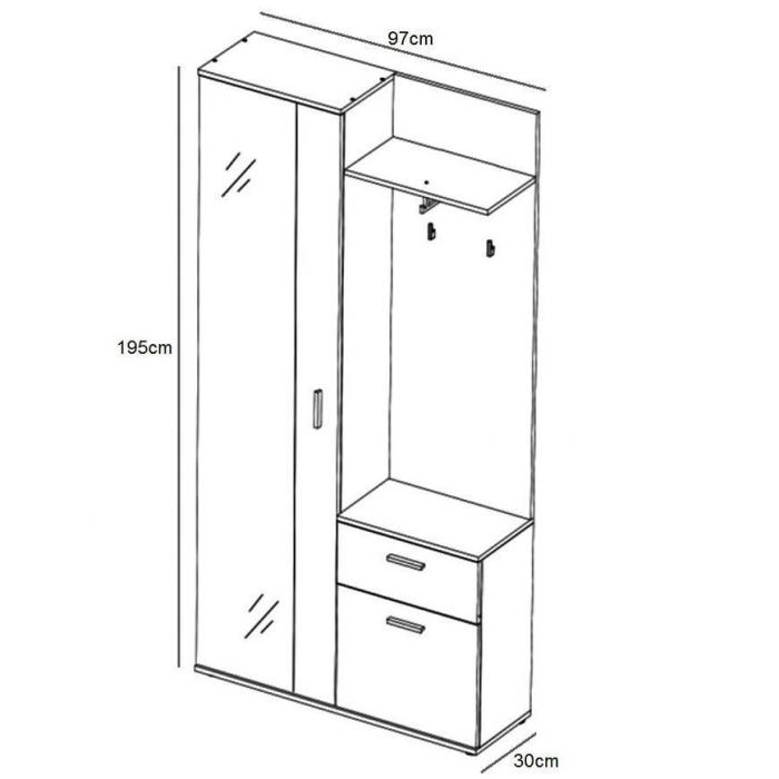 Garderoba jednodrzwiowa z szafką na buty i panelem ściennym z wieszakami na ubrania i półką to centralny punkt Twojego przedpokoju. Z miejscem na ubrania, buty oraz praktyczną półką na akcesoria, pomoże Ci utrzymać porządek w przedpokoju.