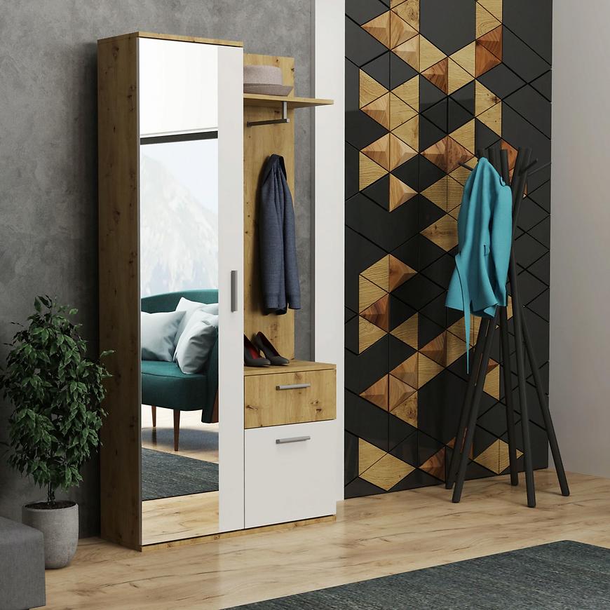 Kolekcja mebli do przedpokoju Justus to perfekcyjne połączenie funkcjonalności, elegancji i nowoczesnego designu. Każdy element tej kolekcji jest starannie wykonany z płyty wiórowej laminowanej, co zapewnia nie tylko trwałość, ale także estetyczny wygląd. Dostępna w białym dekorze z elementami w kolorze dąb artisan przyciąga kolorystycznym połączeniem, która nadaje wnętrzu wyjątkowego charakteru.